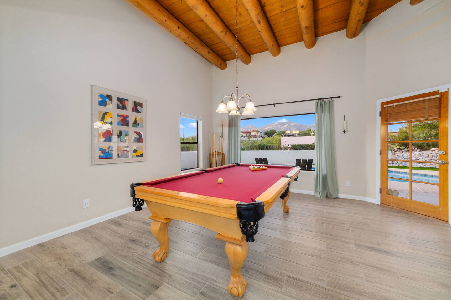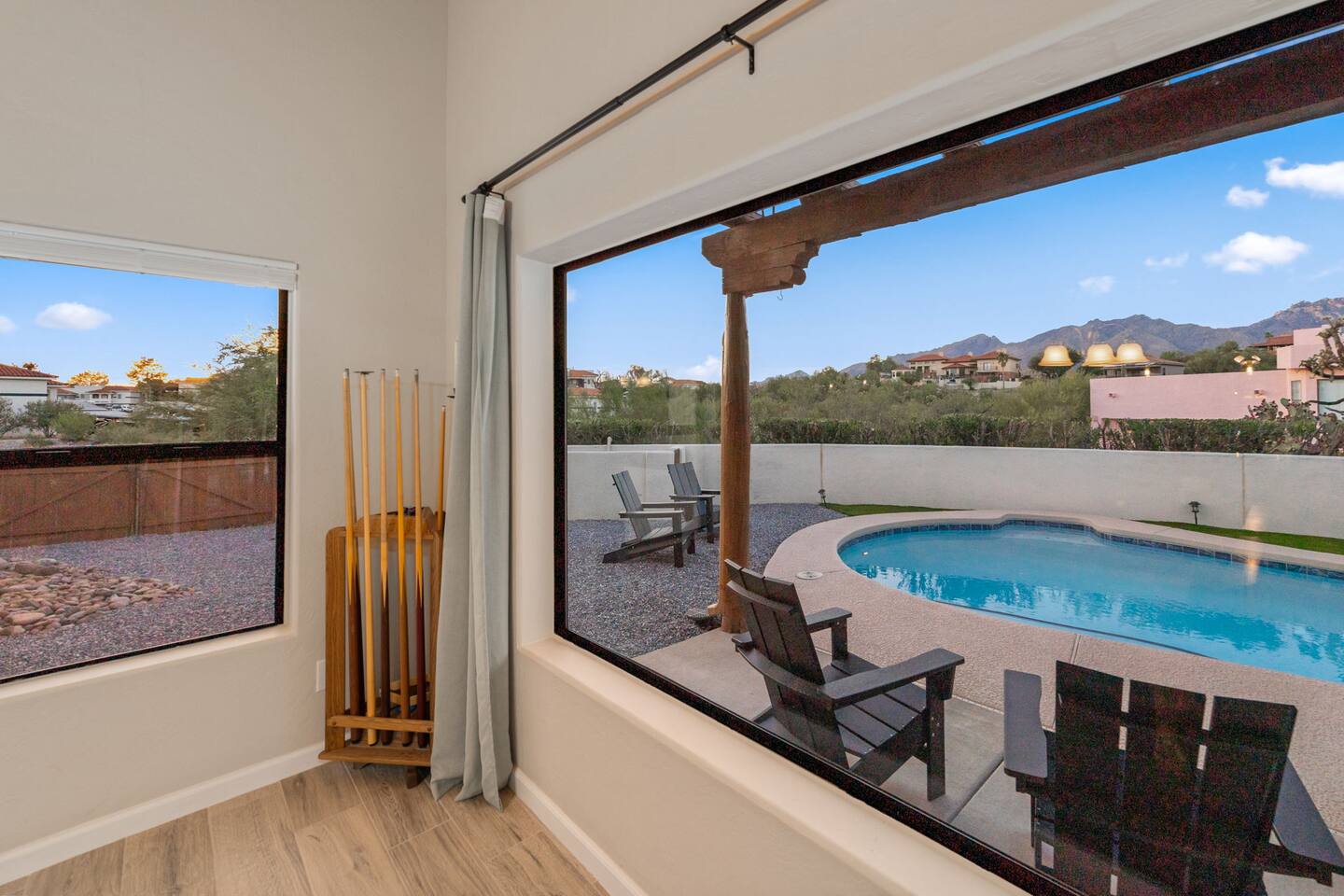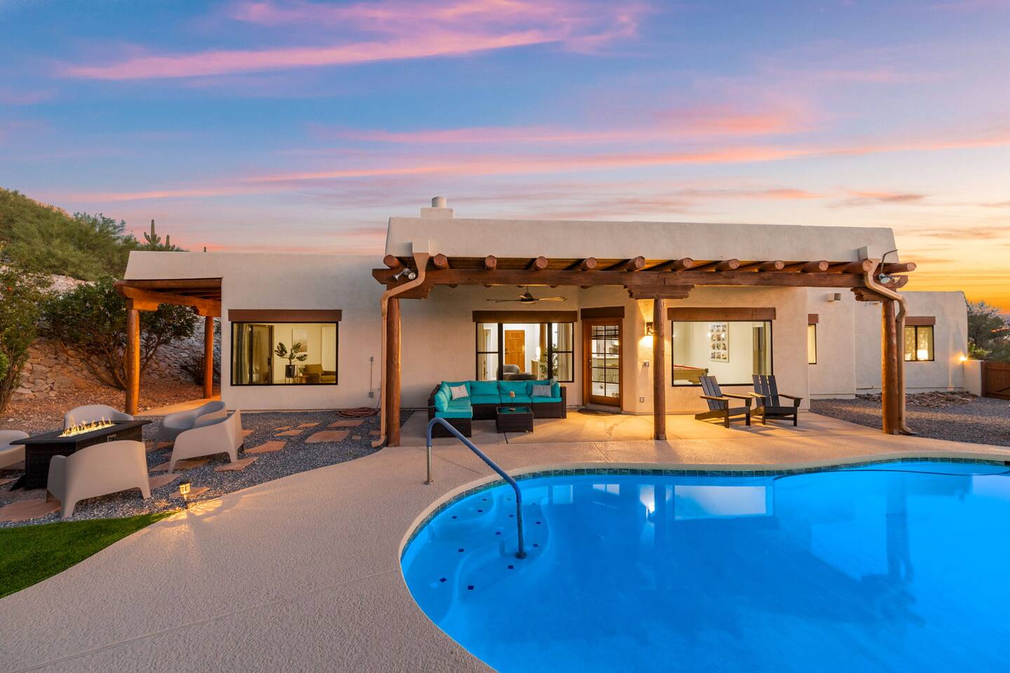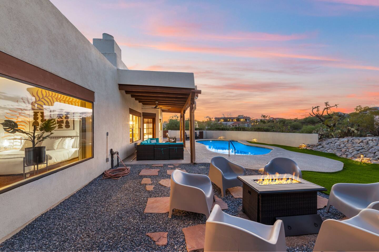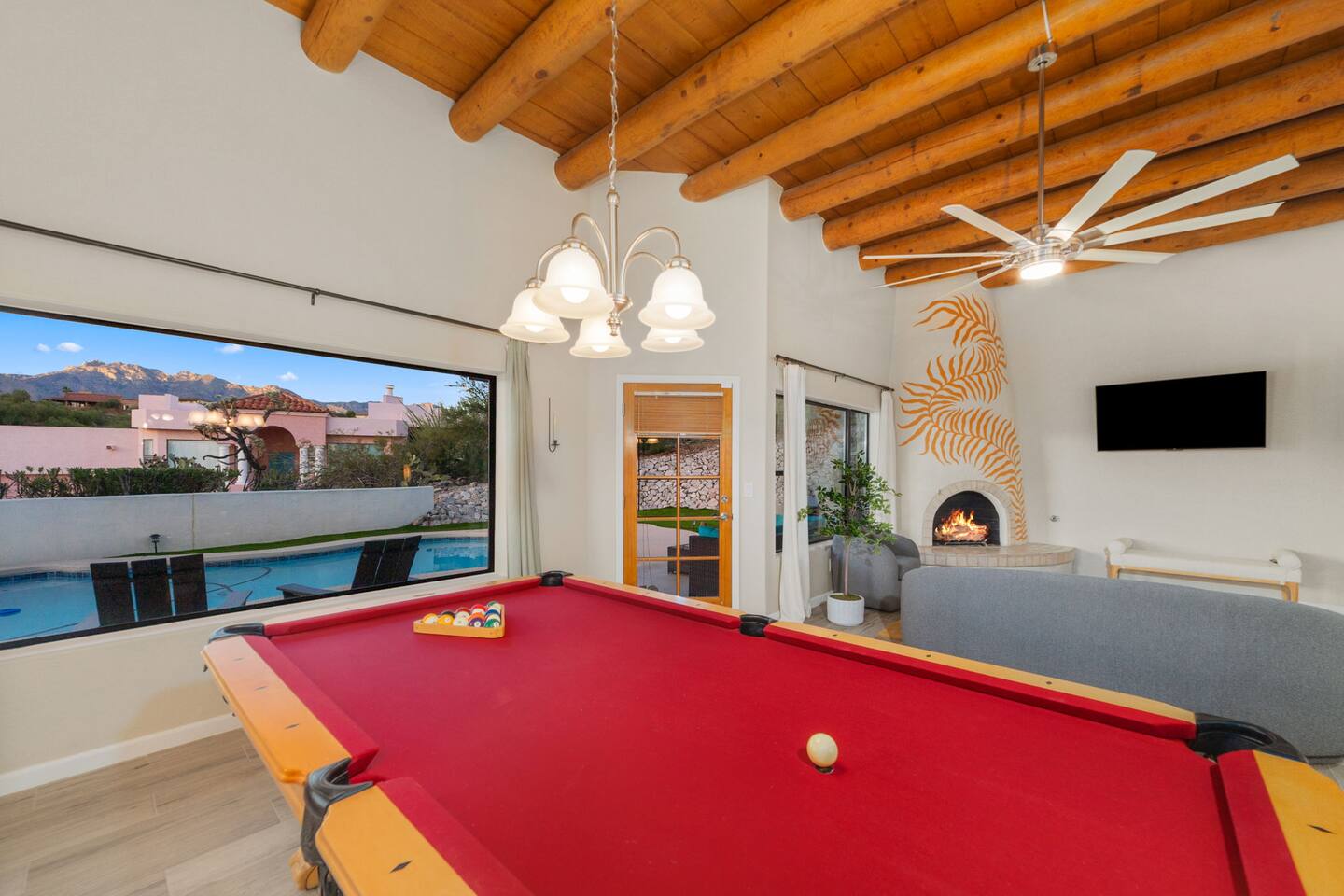 Nestled in the heart of the Rio Verde Vista II neighborhood, this inviting 2031 sq ft home offers a serene retreat in Tucson, Arizona. Located at the crossroads of E River Rd and N Craycroft Rd, this property sits on a generous .44-acre lot, surrounded by the natural beauty of the desert landscape. Step inside and be welcomed by a thoughtfully designed space that balances comfort and style. The open-concept layout is perfect for families or slightly larger groups, offering a seamless flow between the living areas. The bright and airy living room, with its large windows, brings the outdoors in, allowing guests to soak in the stunning views of the desert terrain. The warmth of the Vega beams adds a touch of Southwestern charm, making this space feel both cozy and elegant. Relax by the beehive fireplace, where you can unwind after a day of exploration. The living area also features a comfortable couch and chairs, creating an inviting space to gather with loved ones. Just beyond, a pool table offers a bit of friendly competition, with the sparkling pool serving as a picturesque backdrop. The modern dining area, with seating for six, is perfect for enjoying meals together. Adjacent to the dining area is a fully stocked kitchen, equipped with everything you need to whip up your favorite dishes. Natural light floods the kitchen, bath, and garage through skylights, enhancing the bright and welcoming atmosphere. The home offers four spacious bedrooms, each designed with your comfort in mind. The master suite is a true sanctuary, featuring a king-sized bed, an en-suite bathroom with a stunning shower, and a luxurious soaking tub. The expansive master bedroom also provides ample space to stretch and practice morning yoga, setting the tone for a peaceful day ahead. The additional three bedrooms are equally inviting, each furnished with a queen-sized bed, ensuring a restful night's sleep for everyone. Step outside to discover a newly renovated backyard, where tranquility meets outdoor fun. The beautiful pool beckons for a refreshing dip, while the firepit invites you to gather around and share stories under the stars. With plenty of seating and lounging areas, the outdoor space is perfect for both relaxation and entertainment. This home is designed to offer a blend of comfort, style, and serenity, making it the perfect retreat for your Tucson getaway. Whether you're here to explore the vibrant city or simply unwind in a peaceful setting, this property provides the ideal backdrop for an unforgettable experience.