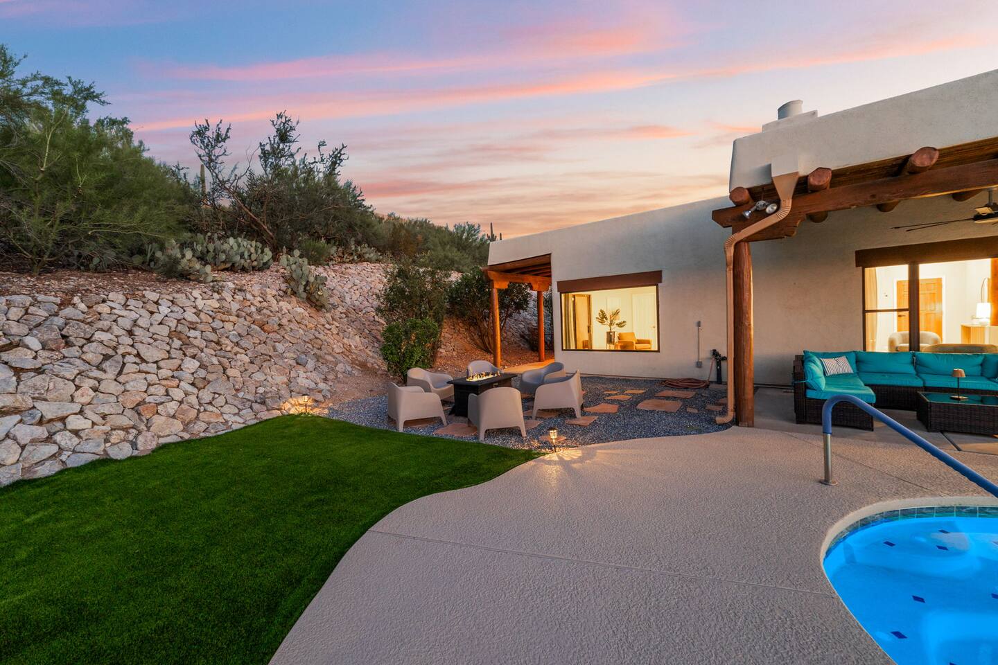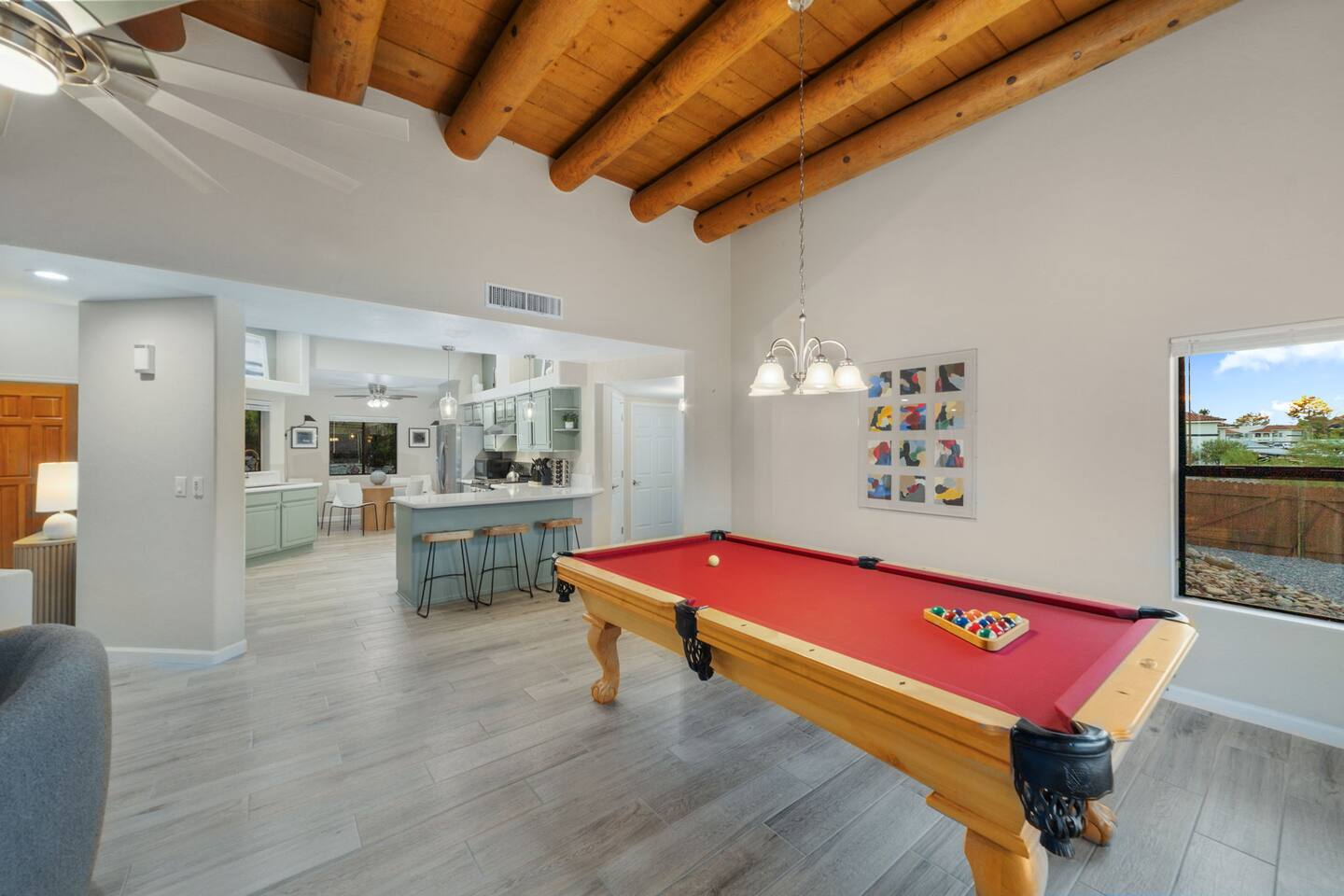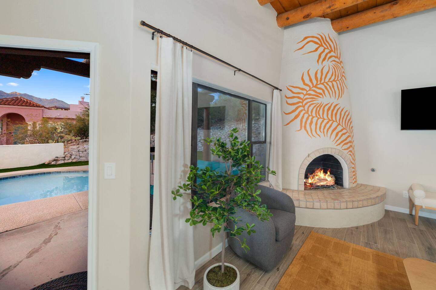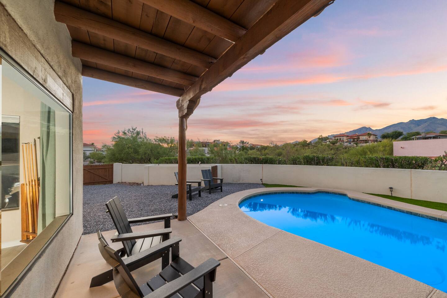 Nestled in the heart of the Rio Verde Vista II neighborhood, this inviting 2031 sq ft home offers a serene retreat in Tucson, Arizona. Located at the crossroads of E River Rd and N Craycroft Rd, this property sits on a generous .44-acre lot, surrounded by the natural beauty of the desert landscape. Step inside and be welcomed by a thoughtfully designed space that balances comfort and style. The open-concept layout is perfect for families or slightly larger groups, offering a seamless flow between the living areas. The bright and airy living room, with its large windows, brings the outdoors in, allowing guests to soak in the stunning views of the desert terrain. The warmth of the Vega beams adds a touch of Southwestern charm, making this space feel both cozy and elegant. Relax by the beehive fireplace, where you can unwind after a day of exploration. The living area also features a comfortable couch and chairs, creating an inviting space to gather with loved ones. Just beyond, a pool table offers a bit of friendly competition, with the sparkling pool serving as a picturesque backdrop. The modern dining area, with seating for six, is perfect for enjoying meals together. Adjacent to the dining area is a fully stocked kitchen, equipped with everything you need to whip up your favorite dishes. Natural light floods the kitchen, bath, and garage through skylights, enhancing the bright and welcoming atmosphere. The home offers four spacious bedrooms, each designed with your comfort in mind. The master suite is a true sanctuary, featuring a king-sized bed, an en-suite bathroom with a stunning shower, and a luxurious soaking tub. The expansive master bedroom also provides ample space to stretch and practice morning yoga, setting the tone for a peaceful day ahead. The additional three bedrooms are equally inviting, each furnished with a queen-sized bed, ensuring a restful night's sleep for everyone. Step outside to discover a newly renovated backyard, where tranquility meets outdoor fun. The beautiful pool beckons for a refreshing dip, while the firepit invites you to gather around and share stories under the stars. With plenty of seating and lounging areas, the outdoor space is perfect for both relaxation and entertainment. This home is designed to offer a blend of comfort, style, and serenity, making it the perfect retreat for your Tucson getaway. Whether you're here to explore the vibrant city or simply unwind in a peaceful setting, this property provides the ideal backdrop for an unforgettable experience.