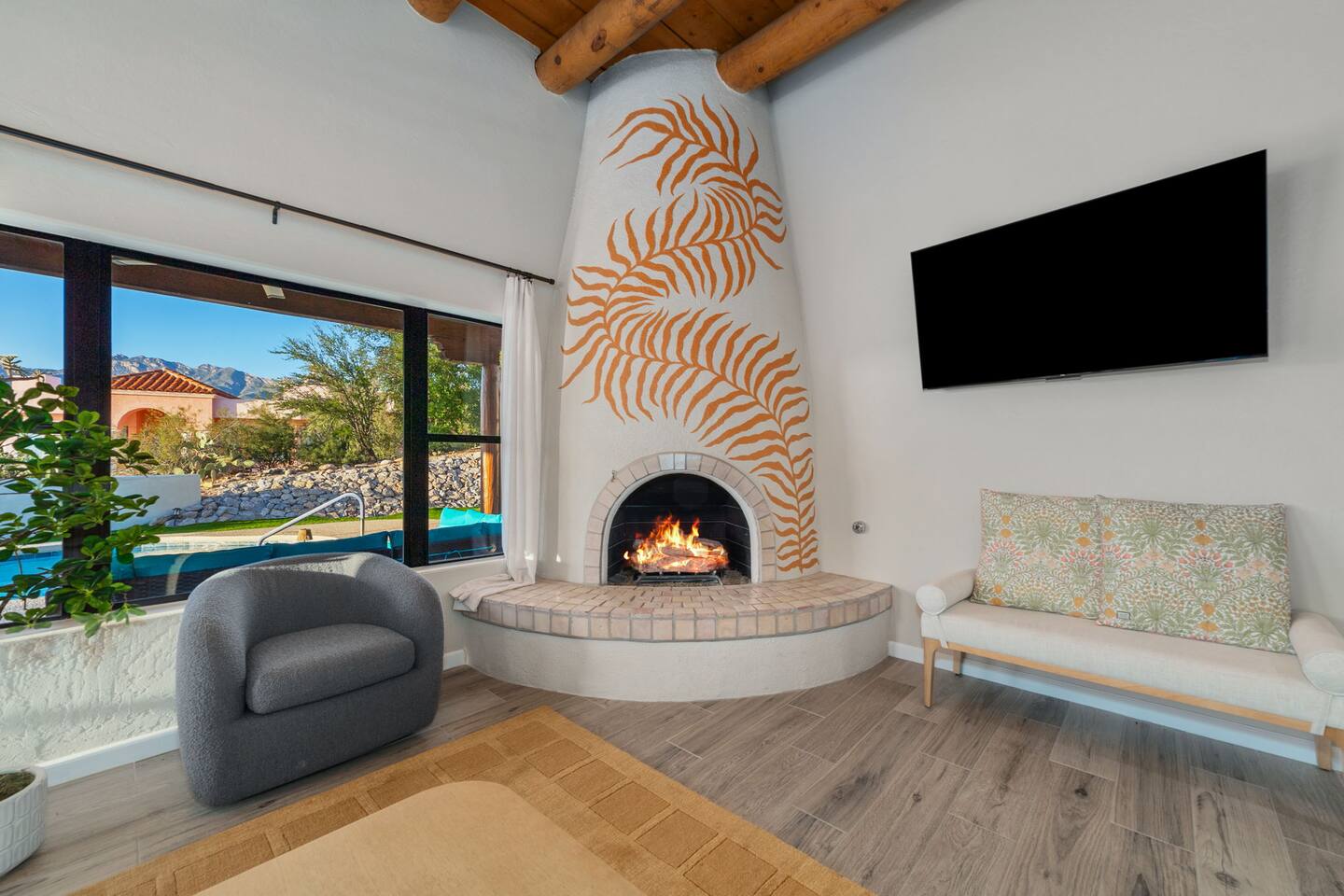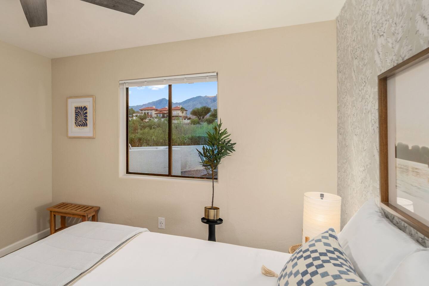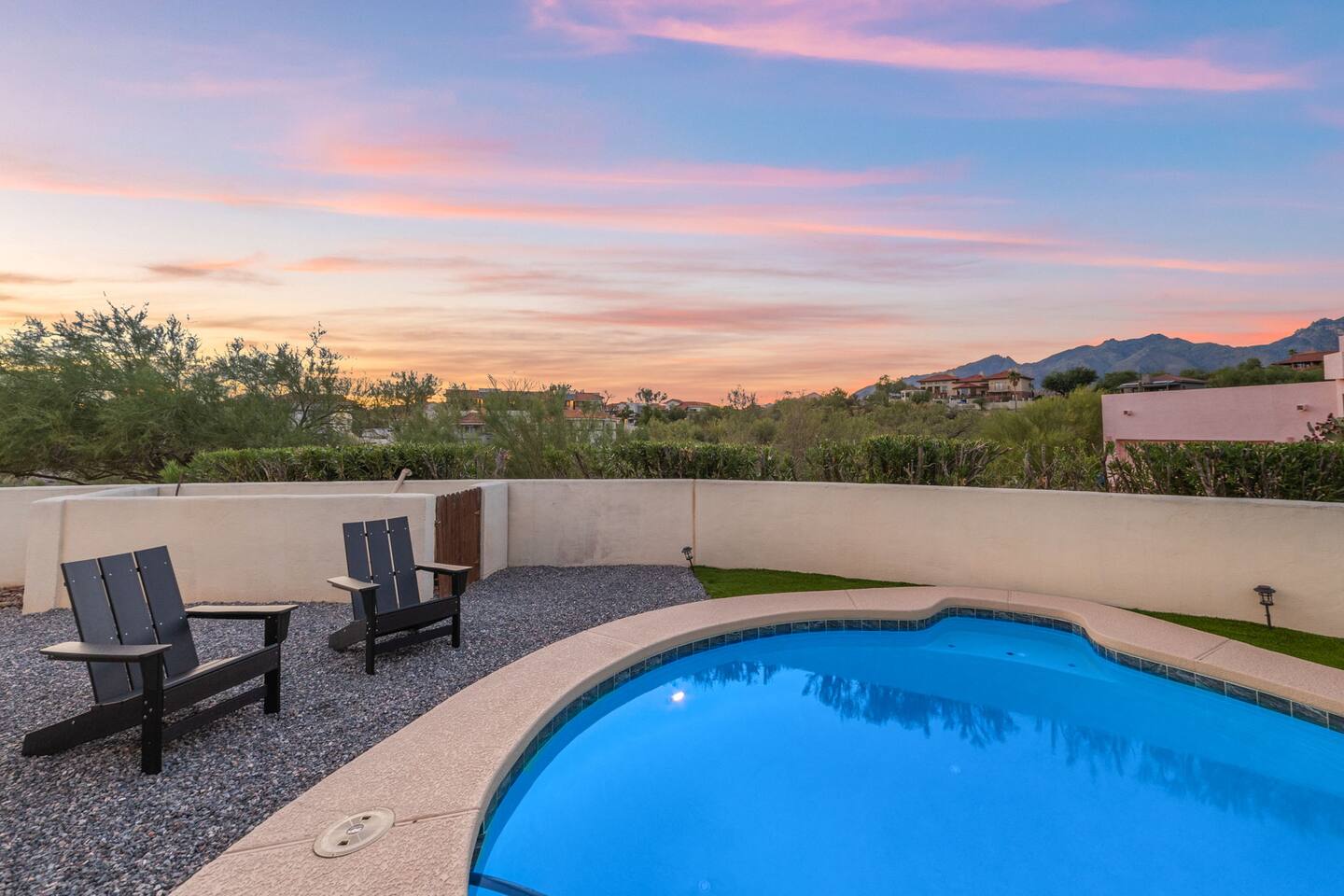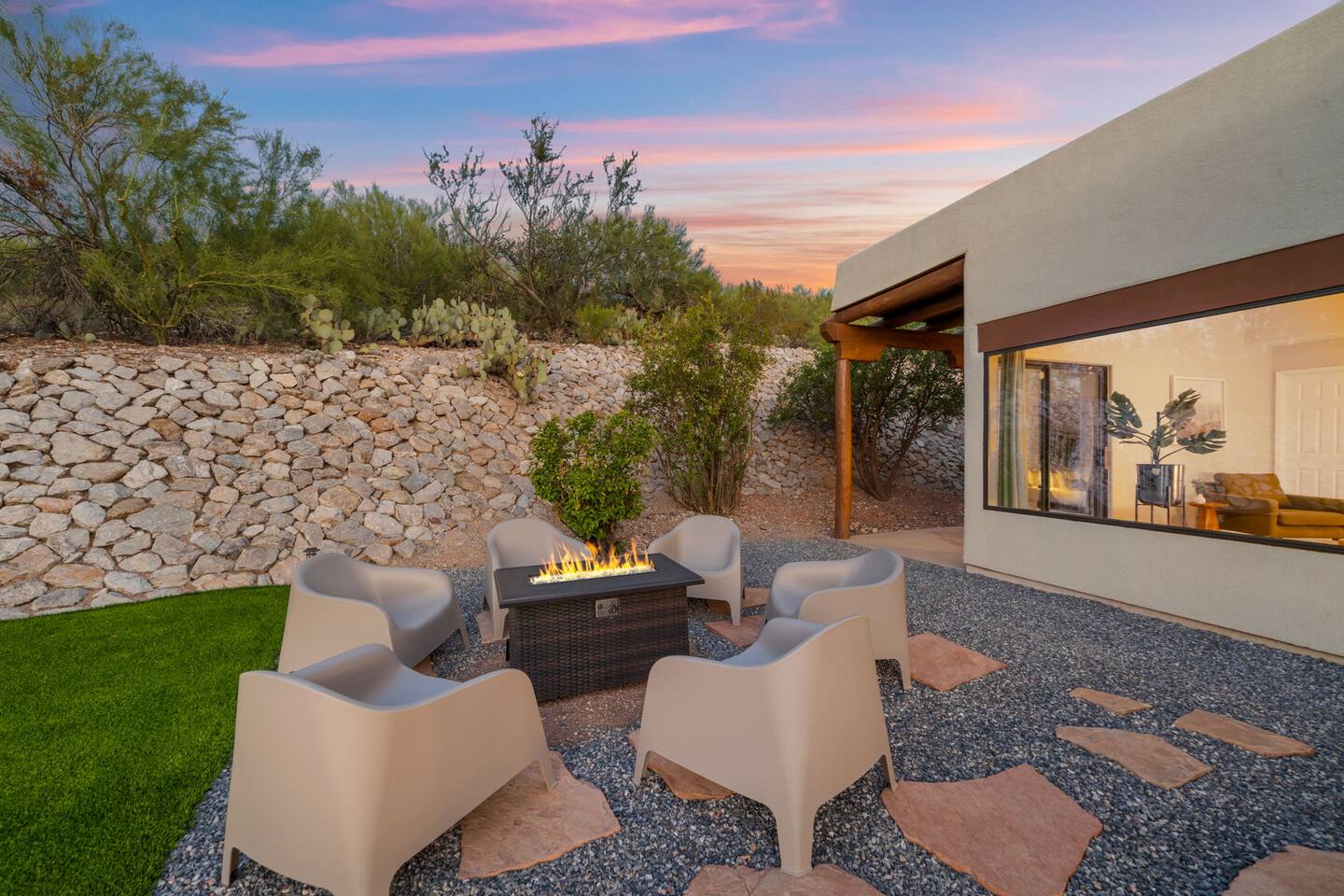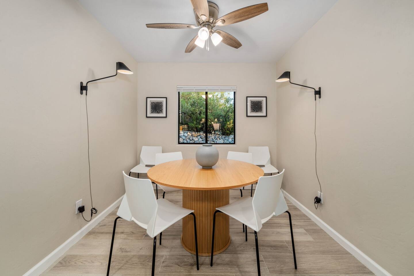 Nestled in the heart of the Rio Verde Vista II neighborhood, this inviting 2031 sq ft home offers a serene retreat in Tucson, Arizona. Located at the crossroads of E River Rd and N Craycroft Rd, this property sits on a generous .44-acre lot, surrounded by the natural beauty of the desert landscape. Step inside and be welcomed by a thoughtfully designed space that balances comfort and style. The open-concept layout is perfect for families or slightly larger groups, offering a seamless flow between the living areas. The bright and airy living room, with its large windows, brings the outdoors in, allowing guests to soak in the stunning views of the desert terrain. The warmth of the Vega beams adds a touch of Southwestern charm, making this space feel both cozy and elegant. Relax by the beehive fireplace, where you can unwind after a day of exploration. The living area also features a comfortable couch and chairs, creating an inviting space to gather with loved ones. Just beyond, a pool table offers a bit of friendly competition, with the sparkling pool serving as a picturesque backdrop. The modern dining area, with seating for six, is perfect for enjoying meals together. Adjacent to the dining area is a fully stocked kitchen, equipped with everything you need to whip up your favorite dishes. Natural light floods the kitchen, bath, and garage through skylights, enhancing the bright and welcoming atmosphere. The home offers four spacious bedrooms, each designed with your comfort in mind. The master suite is a true sanctuary, featuring a king-sized bed, an en-suite bathroom with a stunning shower, and a luxurious soaking tub. The expansive master bedroom also provides ample space to stretch and practice morning yoga, setting the tone for a peaceful day ahead. The additional three bedrooms are equally inviting, each furnished with a queen-sized bed, ensuring a restful night's sleep for everyone. Step outside to discover a newly renovated backyard, where tranquility meets outdoor fun. The beautiful pool beckons for a refreshing dip, while the firepit invites you to gather around and share stories under the stars. With plenty of seating and lounging areas, the outdoor space is perfect for both relaxation and entertainment. This home is designed to offer a blend of comfort, style, and serenity, making it the perfect retreat for your Tucson getaway. Whether you're here to explore the vibrant city or simply unwind in a peaceful setting, this property provides the ideal backdrop for an unforgettable experience.