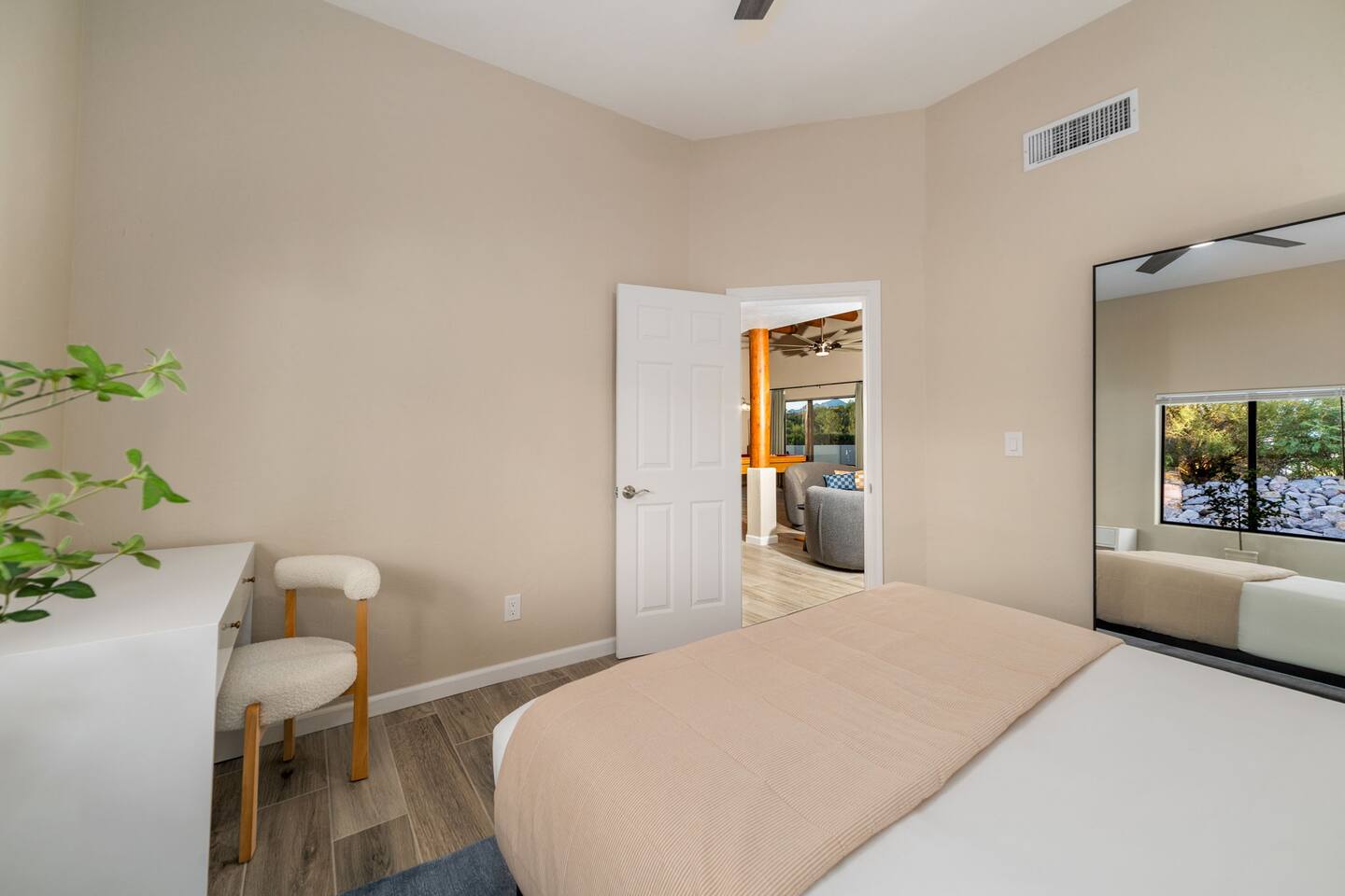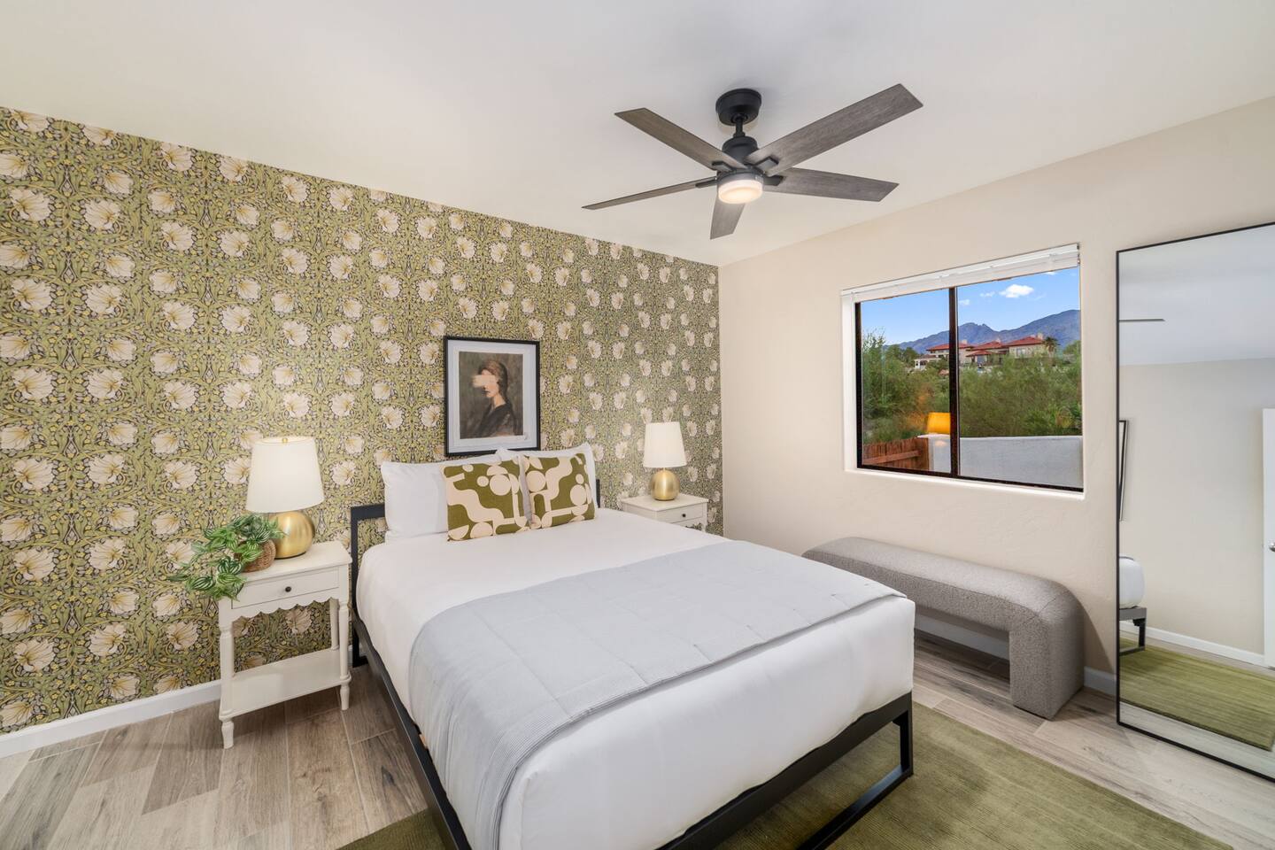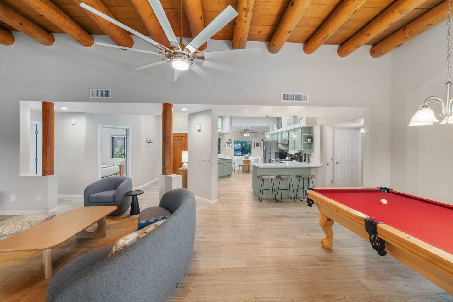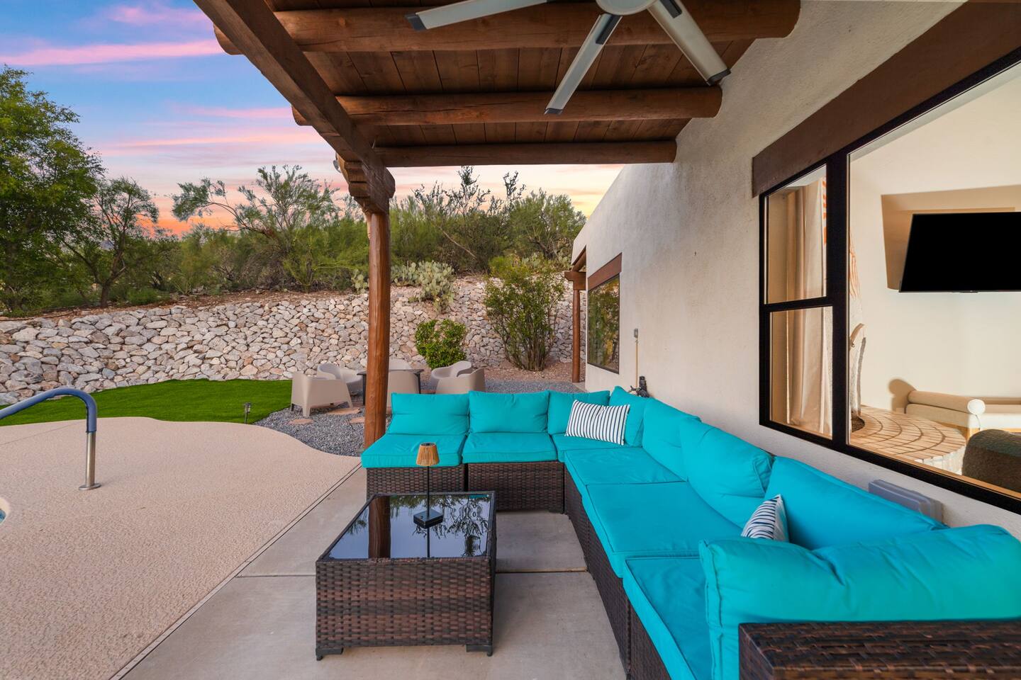 Nestled in the heart of the Rio Verde Vista II neighborhood, this inviting 2031 sq ft home offers a serene retreat in Tucson, Arizona. Located at the crossroads of E River Rd and N Craycroft Rd, this property sits on a generous .44-acre lot, surrounded by the natural beauty of the desert landscape. Step inside and be welcomed by a thoughtfully designed space that balances comfort and style. The open-concept layout is perfect for families or slightly larger groups, offering a seamless flow between the living areas. The bright and airy living room, with its large windows, brings the outdoors in, allowing guests to soak in the stunning views of the desert terrain. The warmth of the Vega beams adds a touch of Southwestern charm, making this space feel both cozy and elegant. Relax by the beehive fireplace, where you can unwind after a day of exploration. The living area also features a comfortable couch and chairs, creating an inviting space to gather with loved ones. Just beyond, a pool table offers a bit of friendly competition, with the sparkling pool serving as a picturesque backdrop. The modern dining area, with seating for six, is perfect for enjoying meals together. Adjacent to the dining area is a fully stocked kitchen, equipped with everything you need to whip up your favorite dishes. Natural light floods the kitchen, bath, and garage through skylights, enhancing the bright and welcoming atmosphere. The home offers four spacious bedrooms, each designed with your comfort in mind. The master suite is a true sanctuary, featuring a king-sized bed, an en-suite bathroom with a stunning shower, and a luxurious soaking tub. The expansive master bedroom also provides ample space to stretch and practice morning yoga, setting the tone for a peaceful day ahead. The additional three bedrooms are equally inviting, each furnished with a queen-sized bed, ensuring a restful night's sleep for everyone. Step outside to discover a newly renovated backyard, where tranquility meets outdoor fun. The beautiful pool beckons for a refreshing dip, while the firepit invites you to gather around and share stories under the stars. With plenty of seating and lounging areas, the outdoor space is perfect for both relaxation and entertainment. This home is designed to offer a blend of comfort, style, and serenity, making it the perfect retreat for your Tucson getaway. Whether you're here to explore the vibrant city or simply unwind in a peaceful setting, this property provides the ideal backdrop for an unforgettable experience.