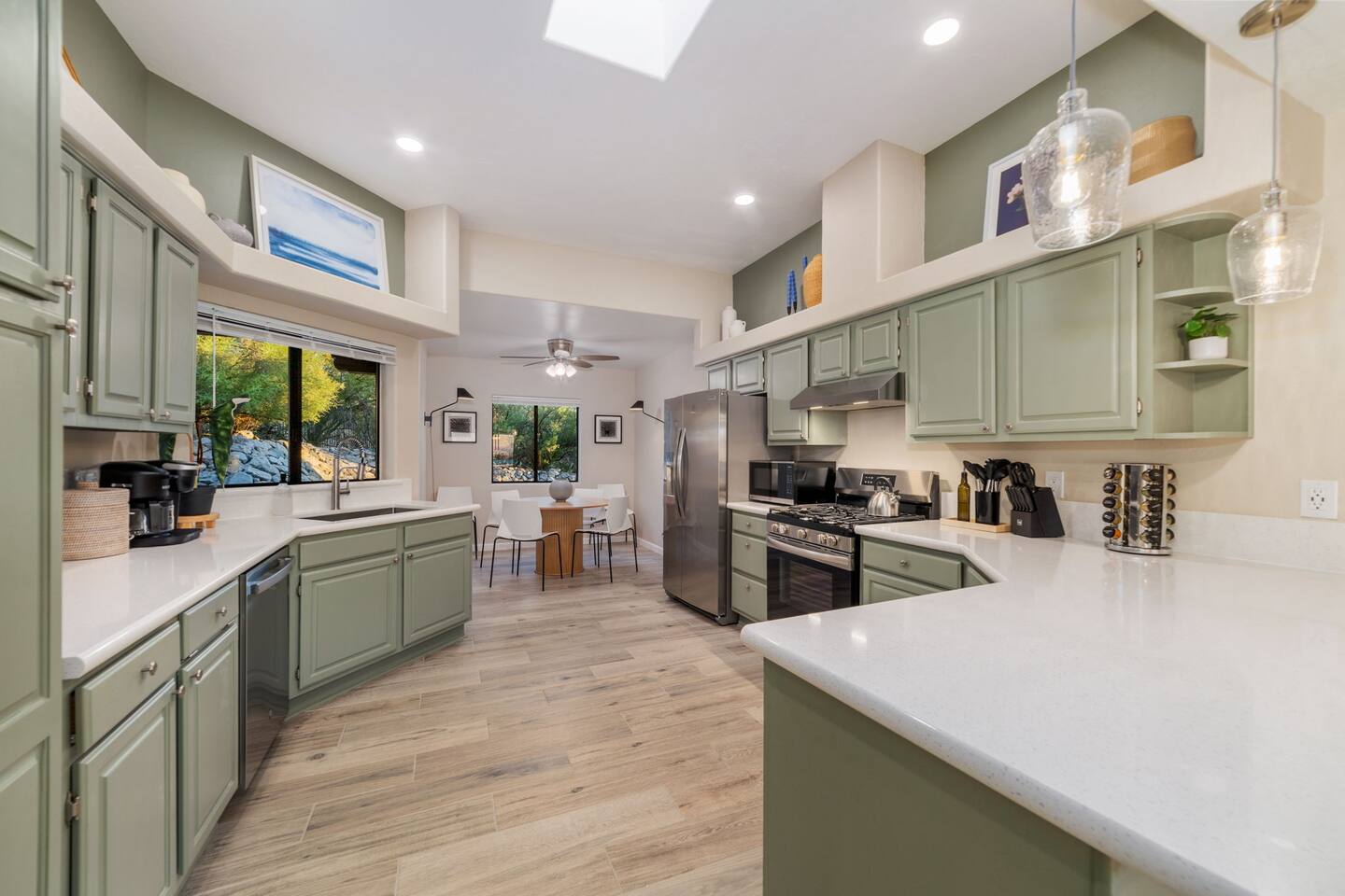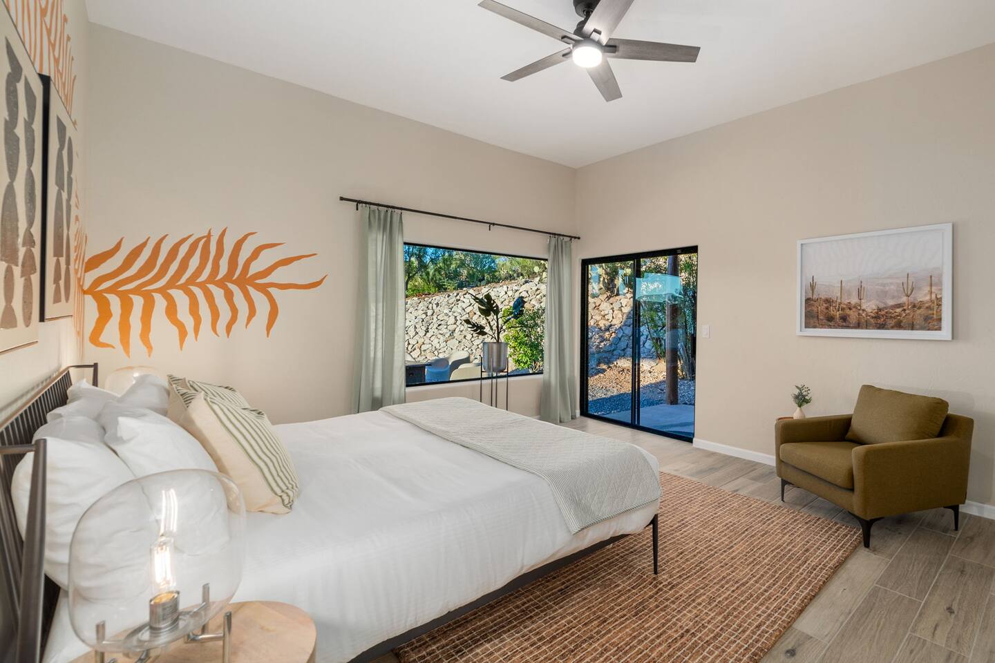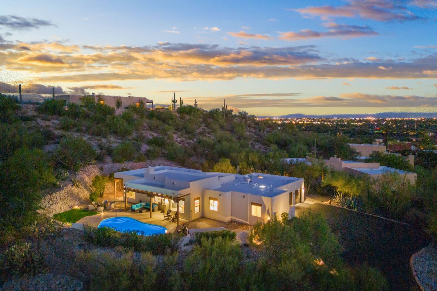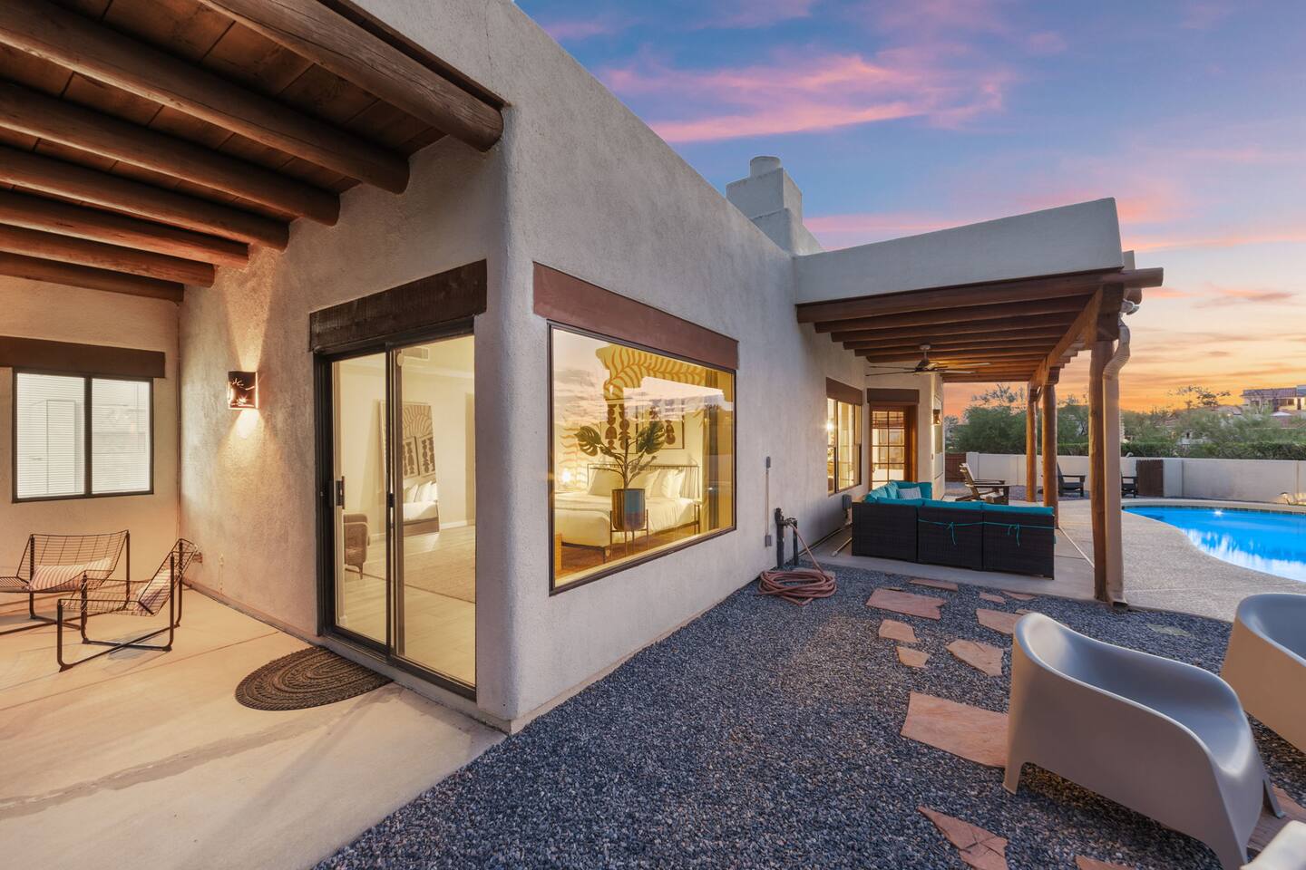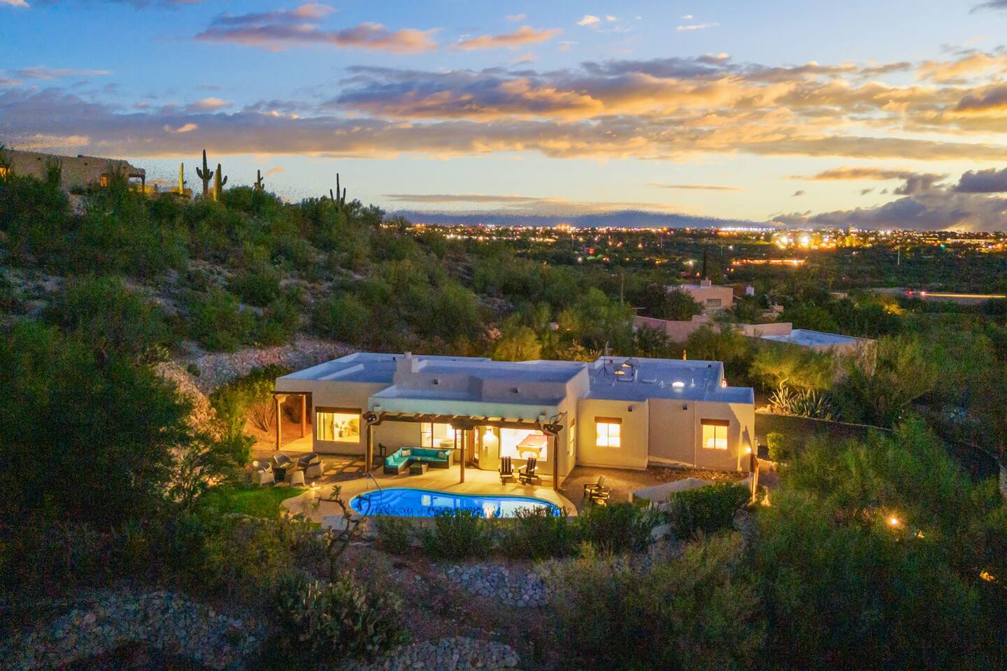 Nestled in the heart of the Rio Verde Vista II neighborhood, this inviting 2031 sq ft home offers a serene retreat in Tucson, Arizona. Located at the crossroads of E River Rd and N Craycroft Rd, this property sits on a generous .44-acre lot, surrounded by the natural beauty of the desert landscape. Step inside and be welcomed by a thoughtfully designed space that balances comfort and style. The open-concept layout is perfect for families or slightly larger groups, offering a seamless flow between the living areas. The bright and airy living room, with its large windows, brings the outdoors in, allowing guests to soak in the stunning views of the desert terrain. The warmth of the Vega beams adds a touch of Southwestern charm, making this space feel both cozy and elegant. Relax by the beehive fireplace, where you can unwind after a day of exploration. The living area also features a comfortable couch and chairs, creating an inviting space to gather with loved ones. Just beyond, a pool table offers a bit of friendly competition, with the sparkling pool serving as a picturesque backdrop. The modern dining area, with seating for six, is perfect for enjoying meals together. Adjacent to the dining area is a fully stocked kitchen, equipped with everything you need to whip up your favorite dishes. Natural light floods the kitchen, bath, and garage through skylights, enhancing the bright and welcoming atmosphere. The home offers four spacious bedrooms, each designed with your comfort in mind. The master suite is a true sanctuary, featuring a king-sized bed, an en-suite bathroom with a stunning shower, and a luxurious soaking tub. The expansive master bedroom also provides ample space to stretch and practice morning yoga, setting the tone for a peaceful day ahead. The additional three bedrooms are equally inviting, each furnished with a queen-sized bed, ensuring a restful night's sleep for everyone. Step outside to discover a newly renovated backyard, where tranquility meets outdoor fun. The beautiful pool beckons for a refreshing dip, while the firepit invites you to gather around and share stories under the stars. With plenty of seating and lounging areas, the outdoor space is perfect for both relaxation and entertainment. This home is designed to offer a blend of comfort, style, and serenity, making it the perfect retreat for your Tucson getaway. Whether you're here to explore the vibrant city or simply unwind in a peaceful setting, this property provides the ideal backdrop for an unforgettable experience.