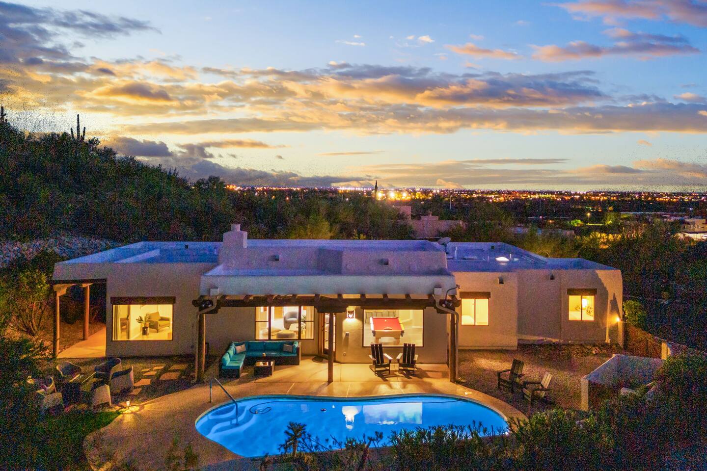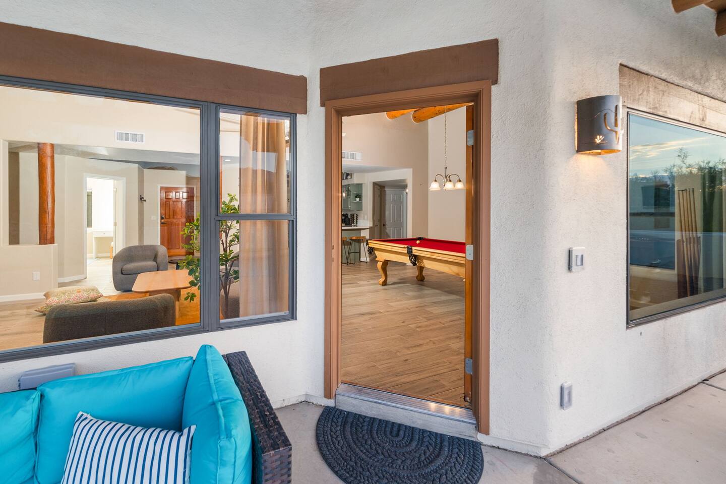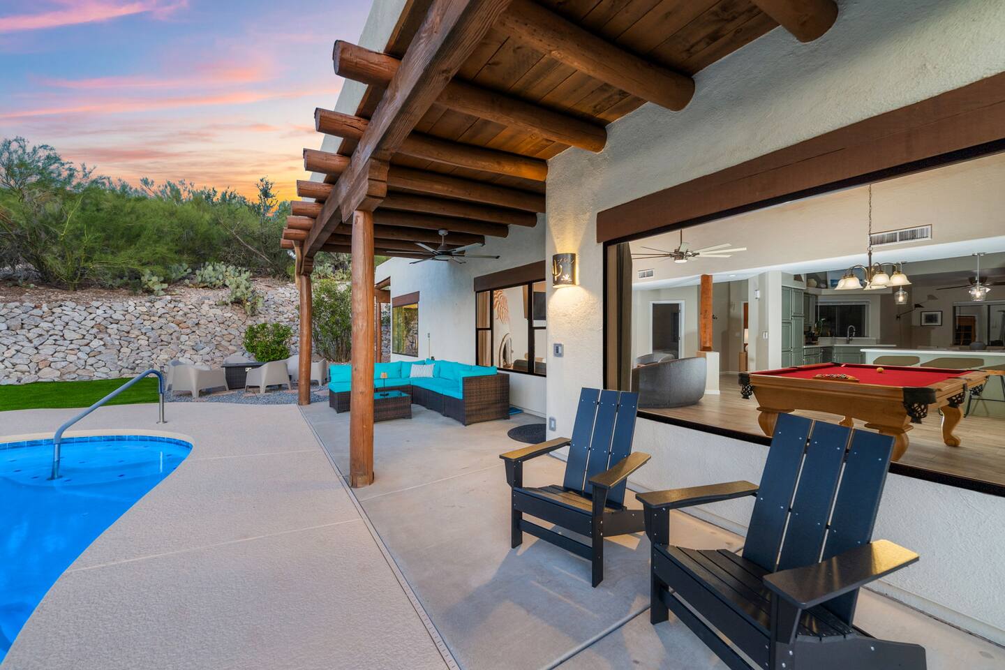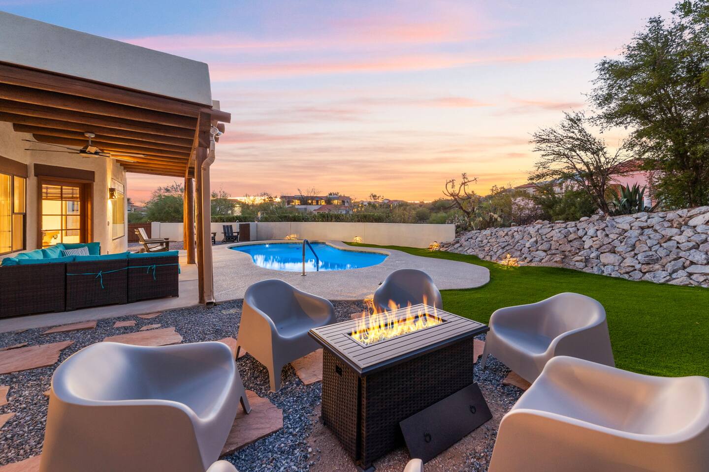 Nestled in Tucson's Rio Verde Vista II, this gorgeous home offers a serene escape. Enjoy an open-concept layout with a bright living room, cozy beehive fireplace, and a pool table overlooking the pool. The master suite features a king bed and spa-like bath. Outside, relax by the pool and firepit in the newly renovated backyard. Perfect for families and groups seeking comfort and style. This home was carefully curated by a designer!