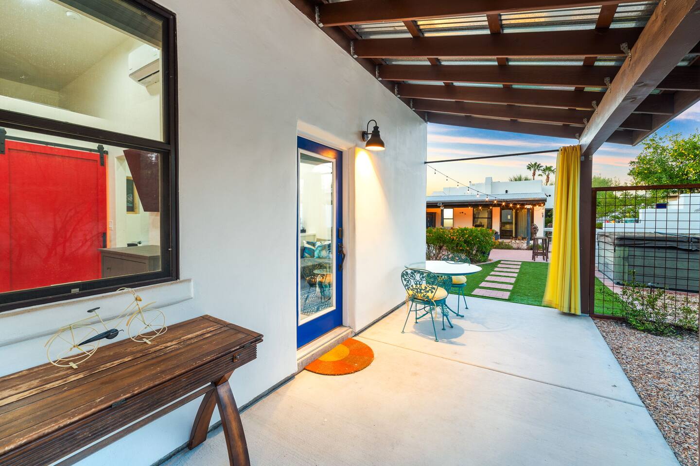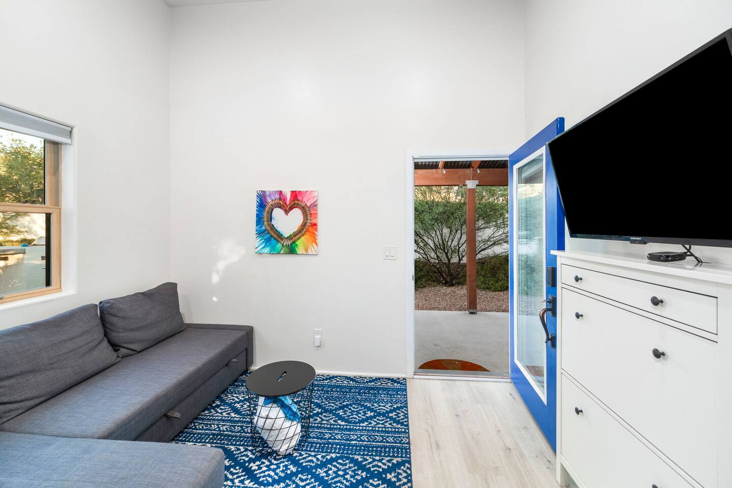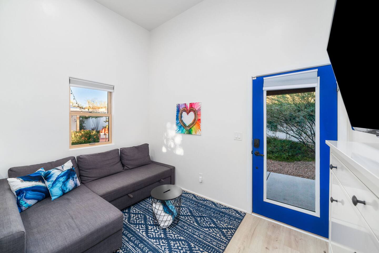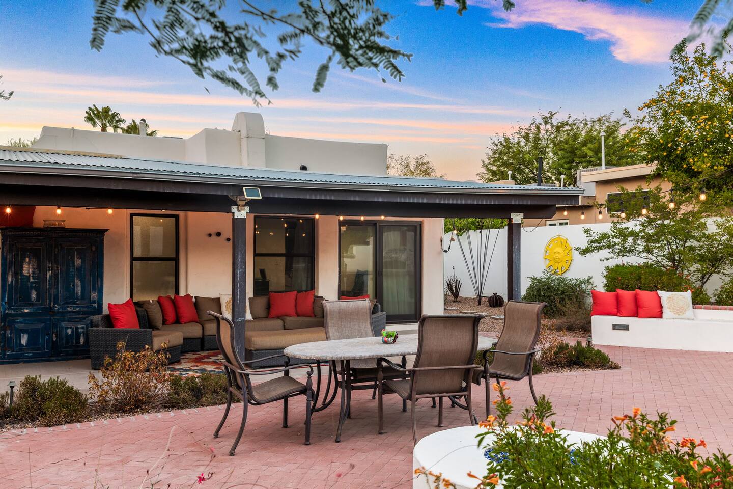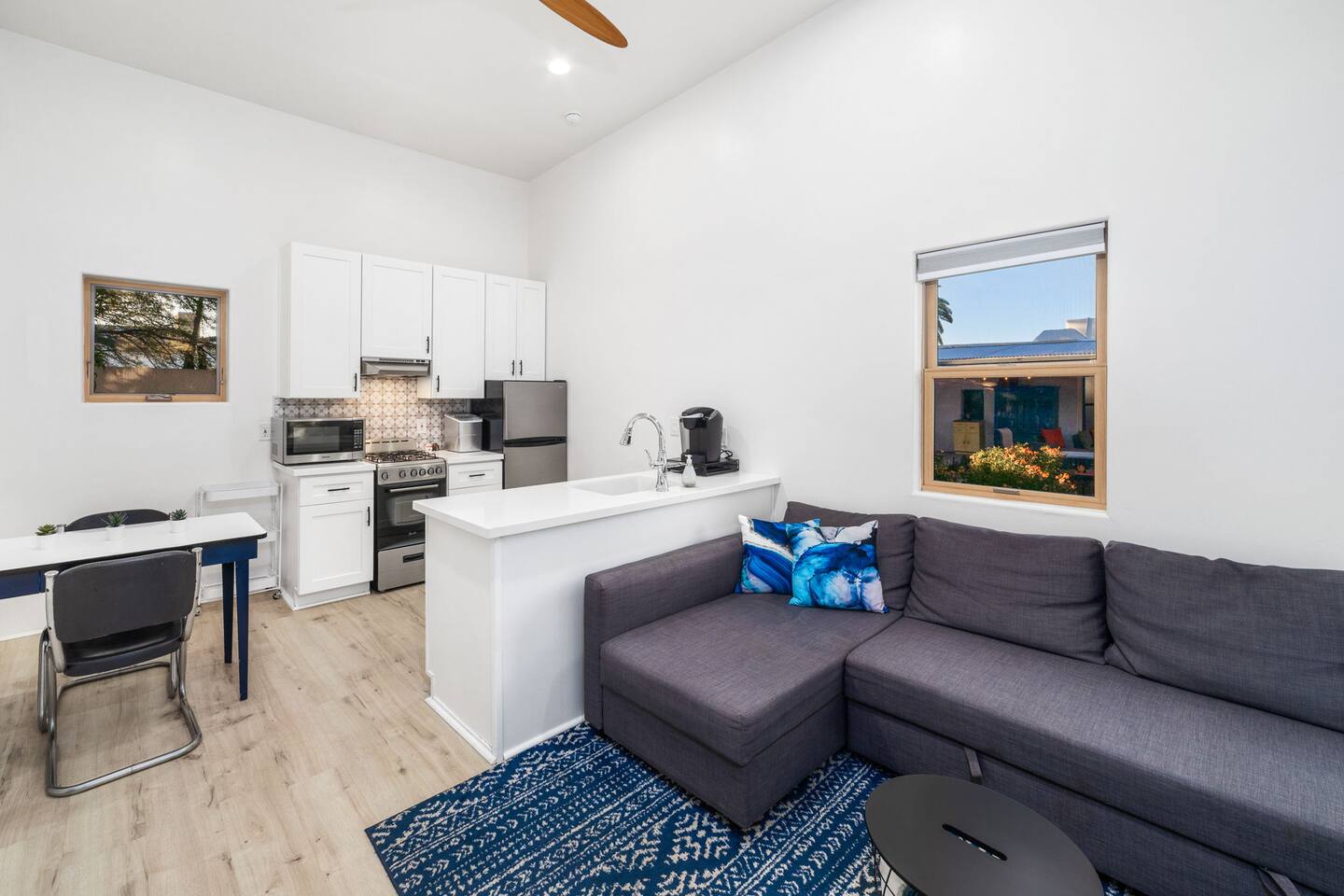 Welcome to your peaceful retreat in the heart of Tucson, nestled in the charming Sam Hughes neighborhood, within the historic Blenman Elm district. Located conveniently near E Speedway Blvd and N Campbell Ave, this home combines vintage character with modern comfort—ideal for a memorable long-term stay or a refreshing weekend escape. Step inside, where every corner of this thoughtfully designed property has been curated with comfort in mind. The open-concept layout creates a spacious and inviting atmosphere, with natural light filling each room. The airy living room is the perfect relaxation space, featuring a large sectional that seamlessly transforms into an extra sleeping area when needed. Enjoy picturesque views of the lush backyard from the living room’s expansive windows, where green spaces await just outside. The dining area is both stylish and practical, providing seating for two at a modern table that doubles as a convenient workspace. Adjacent, the fully stocked kitchen has everything you need to cook up delicious meals, from breakfast spreads to cozy dinners. With plenty of counter space and modern appliances, it’s a breeze to prepare and share your favorite dishes. The bedroom, designed to offer a restful night’s sleep. The suite is a true highlight, featuring a luxurious queen-sized bed, a large TV, and a private en-suite bathroom complete with a beautiful walk-in shower. Outside, step into the beautifully redesigned shared backyard, a private oasis where you can unwind in the Arizona sun. This guest house has exclusive access to the yard, allowing you to enjoy the space fully at your leisure. Here, you’ll find a cozy firepit perfect for evenings under the stars and plenty of lounge seating for lazy afternoons or a relaxed evening gathering. With the peaceful surroundings, this outdoor space is ideal for unwinding, sharing stories, or enjoying quiet moments with a book. With modern conveniences, serene spaces, and a prime Tucson location, this retreat offers an unforgettable guest experience that blends comfort, convenience, and character. Welcome to your perfect Tucson getaway!