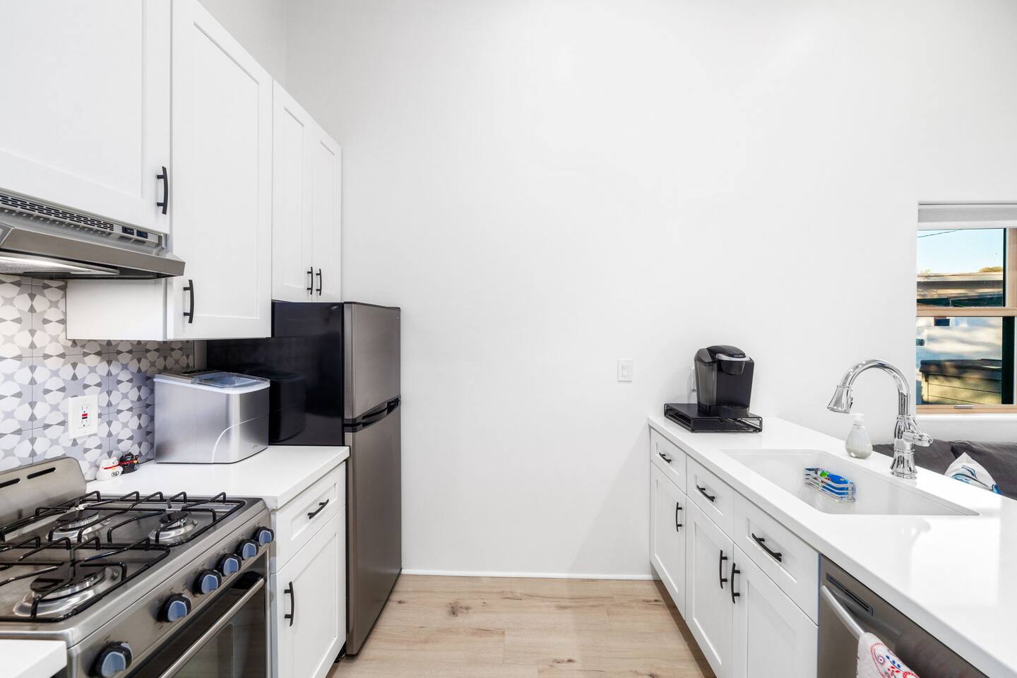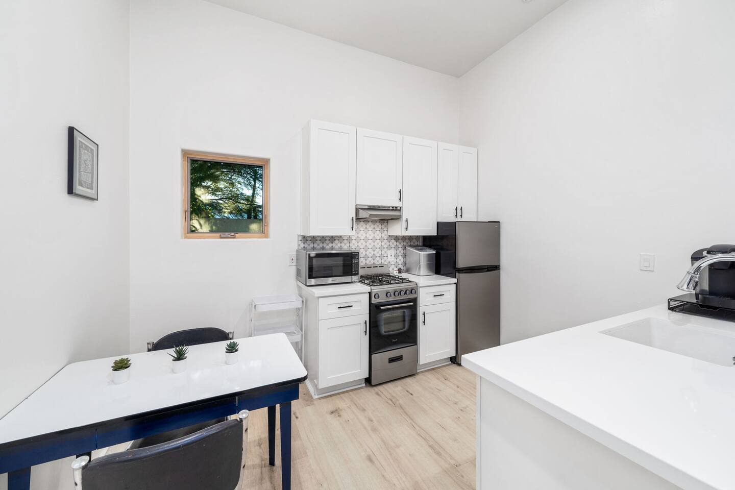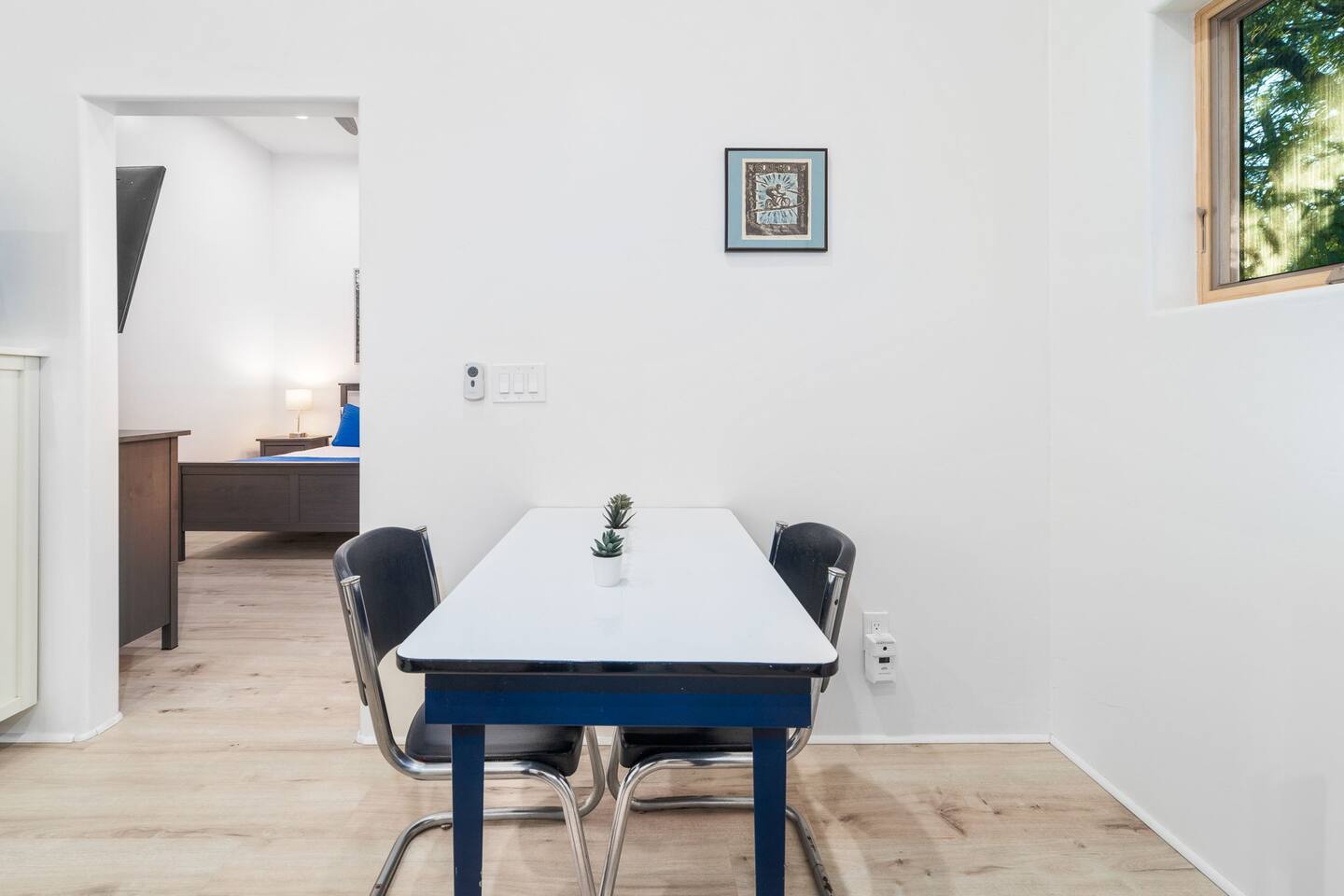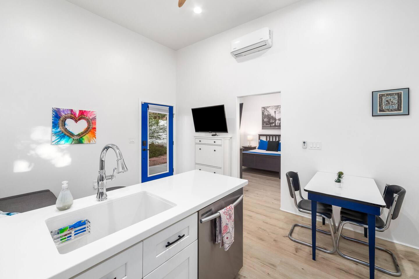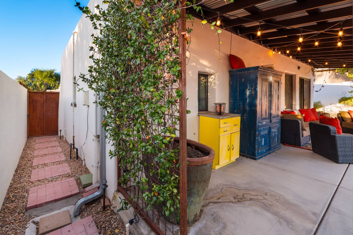 Welcome to your peaceful retreat in the heart of Tucson, nestled in the charming Sam Hughes neighborhood, within the historic Blenman Elm district. Located conveniently near E Speedway Blvd and N Campbell Ave, this home combines vintage character with modern comfort—ideal for a memorable long-term stay or a refreshing weekend escape. Step inside, where every corner of this thoughtfully designed property has been curated with comfort in mind. The open-concept layout creates a spacious and inviting atmosphere, with natural light filling each room. The airy living room is the perfect relaxation space, featuring a large sectional that seamlessly transforms into an extra sleeping area when needed. Enjoy picturesque views of the lush backyard from the living room’s expansive windows, where green spaces await just outside. The dining area is both stylish and practical, providing seating for two at a modern table that doubles as a convenient workspace. Adjacent, the fully stocked kitchen has everything you need to cook up delicious meals, from breakfast spreads to cozy dinners. With plenty of counter space and modern appliances, it’s a breeze to prepare and share your favorite dishes. The bedroom, designed to offer a restful night’s sleep. The suite is a true highlight, featuring a luxurious queen-sized bed, a large TV, and a private en-suite bathroom complete with a beautiful walk-in shower. Outside, step into the beautifully redesigned shared backyard, a private oasis where you can unwind in the Arizona sun. This guest house has exclusive access to the yard, allowing you to enjoy the space fully at your leisure. Here, you’ll find a cozy firepit perfect for evenings under the stars and plenty of lounge seating for lazy afternoons or a relaxed evening gathering. With the peaceful surroundings, this outdoor space is ideal for unwinding, sharing stories, or enjoying quiet moments with a book. With modern conveniences, serene spaces, and a prime Tucson location, this retreat offers an unforgettable guest experience that blends comfort, convenience, and character. Welcome to your perfect Tucson getaway!