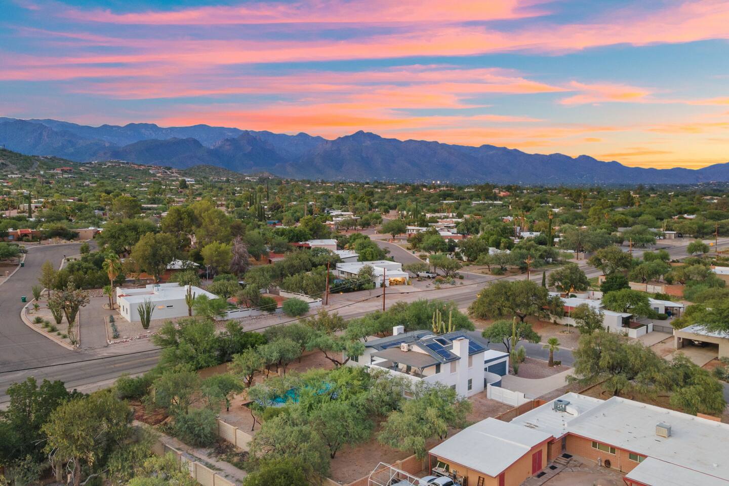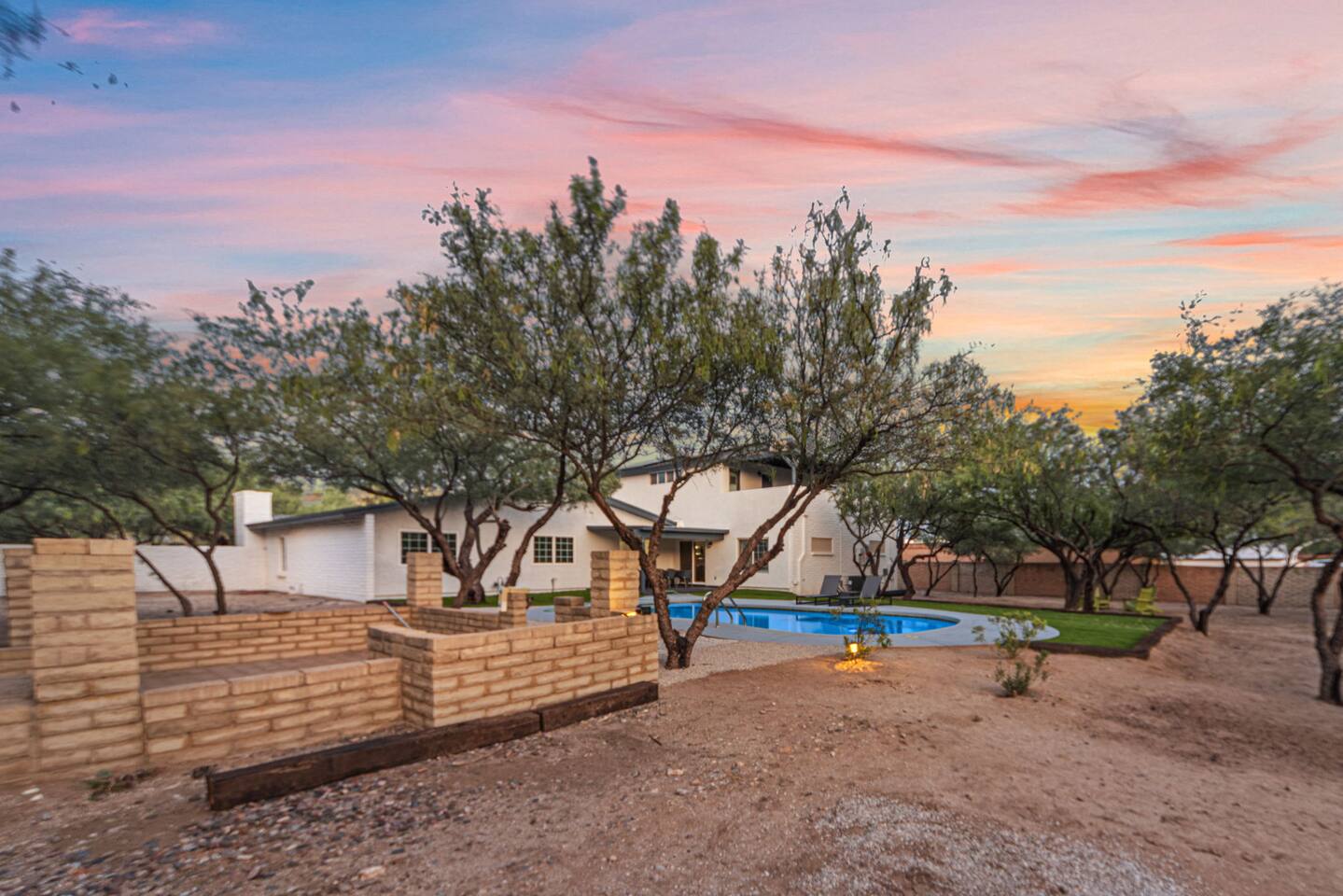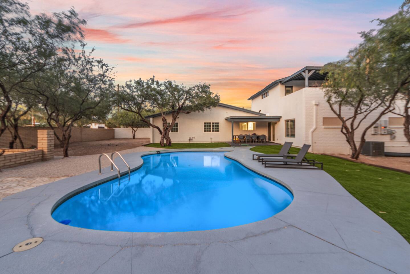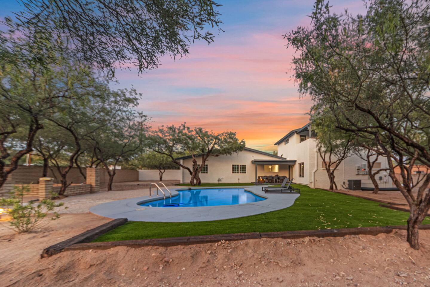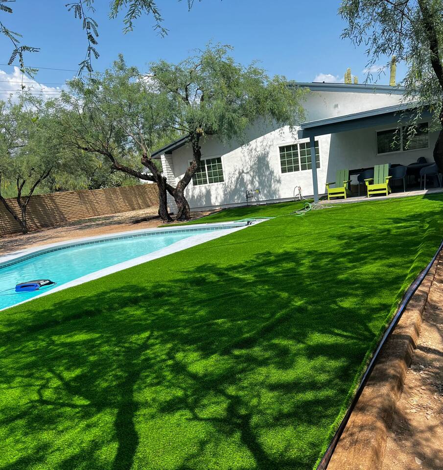 Welcome to our beautifully designed home in the heart of the Sabino Canyon area, located conveniently at the major cross streets of E Cloud Rd and N Sabino Canyon Rd. This home, crafted with comfort and style by a local interior designer, is perfect for larger groups and families seeking a memorable stay in Tucson. As you step inside, you'll be greeted by an open-concept living space that invites relaxation and fun. The living room features a comfortable sectional couch, a foosball table, board games, and a large TV, making it an ideal spot for both relaxation and entertainment. Adjacent to the living area is a modern dining space that comfortably seats six, perfect for family meals or gatherings. Just off the dining area, you'll find a pool table, adding to the home's entertainment options. The fully stocked kitchen is a chef's dream, equipped with everything you need to prepare delicious meals for your group. The home boasts six spacious bedrooms, each thoughtfully designed with your comfort in mind. The master bedroom, located upstairs for added privacy, is a true retreat. It features a king-sized bed, a cozy seating area, and ample space perfect for morning yoga. The two large skylights in the master bedroom allow you to wake up naturally with the sunrise, and you can enjoy your morning coffee on the private balcony. Bedrooms two and three each offer a king-sized bed for ultimate comfort, while bedrooms four and five are furnished with queen-sized beds. The sixth bedroom is perfect for kids or larger groups, with two bunk beds providing four single sleeping areas, a pull-out couch, and a vintage Pac-Man arcade game for endless fun. Outside, the home continues to impress with a beautiful large pool and a firepit, perfect for summer nights or chilly winter evenings. Whether you're looking to relax, entertain, or explore the beautiful surroundings of Sabino Canyon, this home provides the perfect setting for your stay in Tucson.Welcome to our beautifully designed home in the heart of the Sabino Canyon area, located conveniently at the major cross streets of E Cloud Rd and N Sabino Canyon Rd. This home, crafted with comfort and style by a local interior designer, is perfect for larger groups and families seeking a memorable stay in Tucson. As you step inside, you'll be greeted by an open-concept living space that invites relaxation and fun. The living room features a comfortable sectional couch, a foosball table, board games, and a large TV, making it an ideal spot for both relaxation and entertainment. Adjacent to the living area is a modern dining space that comfortably seats six, perfect for family meals or gatherings. Just off the dining area, you'll find a pool table, adding to the home's entertainment options. The fully stocked kitchen is a chef's dream, equipped with everything you need to prepare delicious meals for your group. The home boasts six spacious bedrooms, each thoughtfully designed with your comfort in mind. The master bedroom, located upstairs for added privacy, is a true retreat. It features a king-sized bed, a cozy seating area, and ample space perfect for morning yoga. The two large skylights in the master bedroom allow you to wake up naturally with the sunrise, and you can enjoy your morning coffee on the private balcony. Bedrooms two and three each offer a king-sized bed for ultimate comfort, while bedrooms four and five are furnished with queen-sized beds. The sixth bedroom is perfect for kids or larger groups, with two bunk beds providing four single sleeping areas, a pull-out couch, and a vintage Pac-Man arcade game for endless fun. Outside, the home continues to impress with a beautiful large pool. Whether you're looking to relax, entertain, or explore the beautiful surroundings of Sabino Canyon, this home provides the perfect setting for your stay in Tucson.