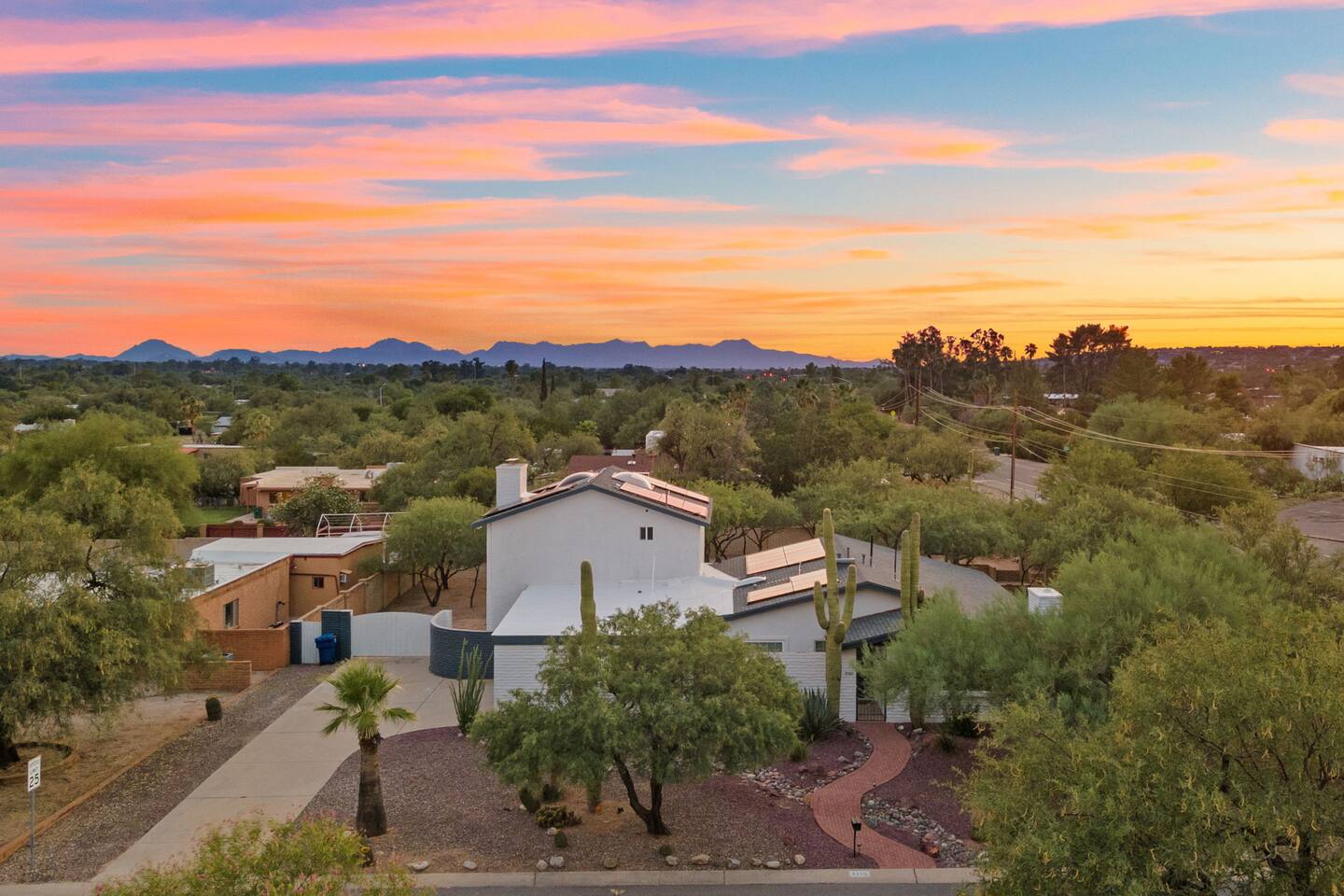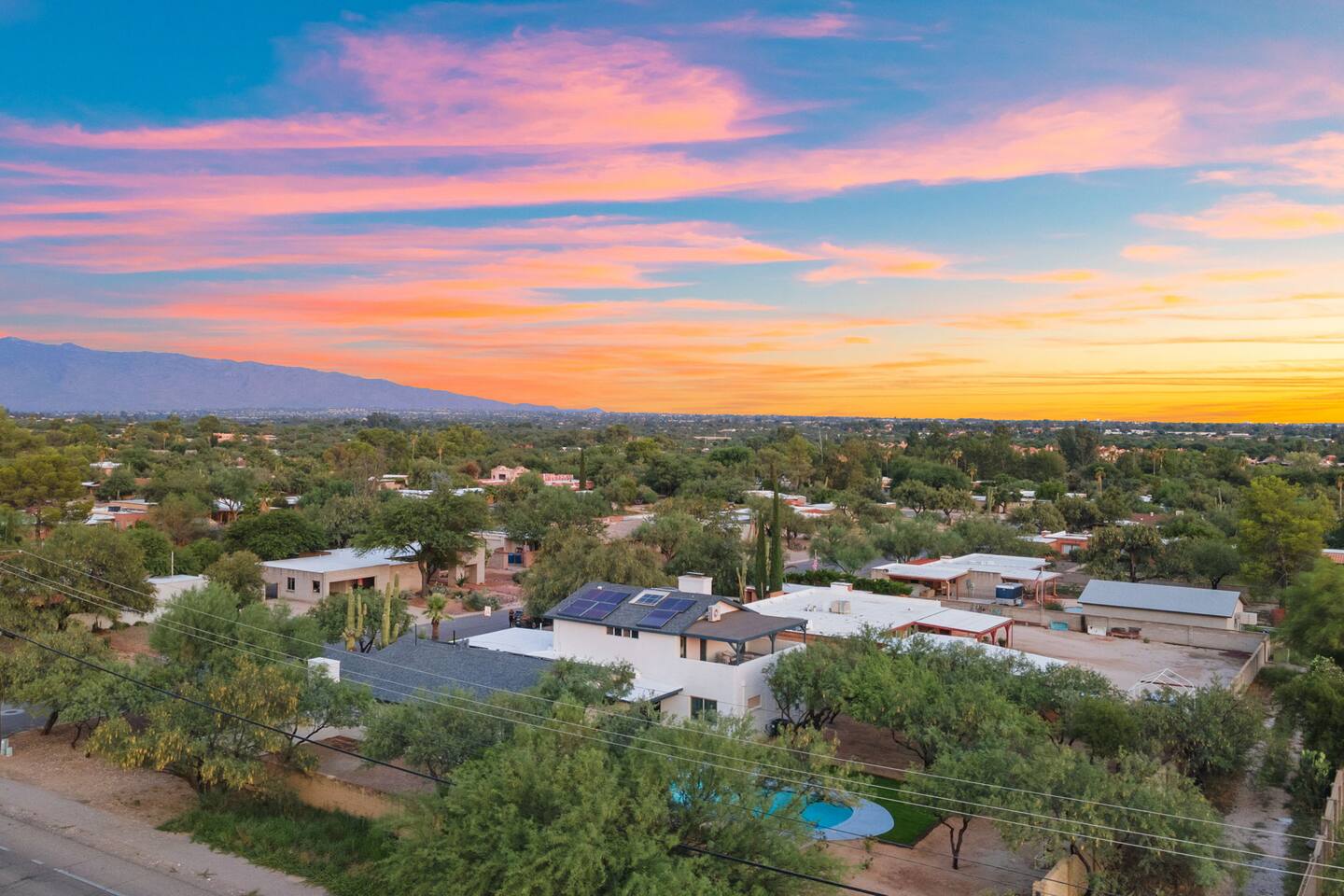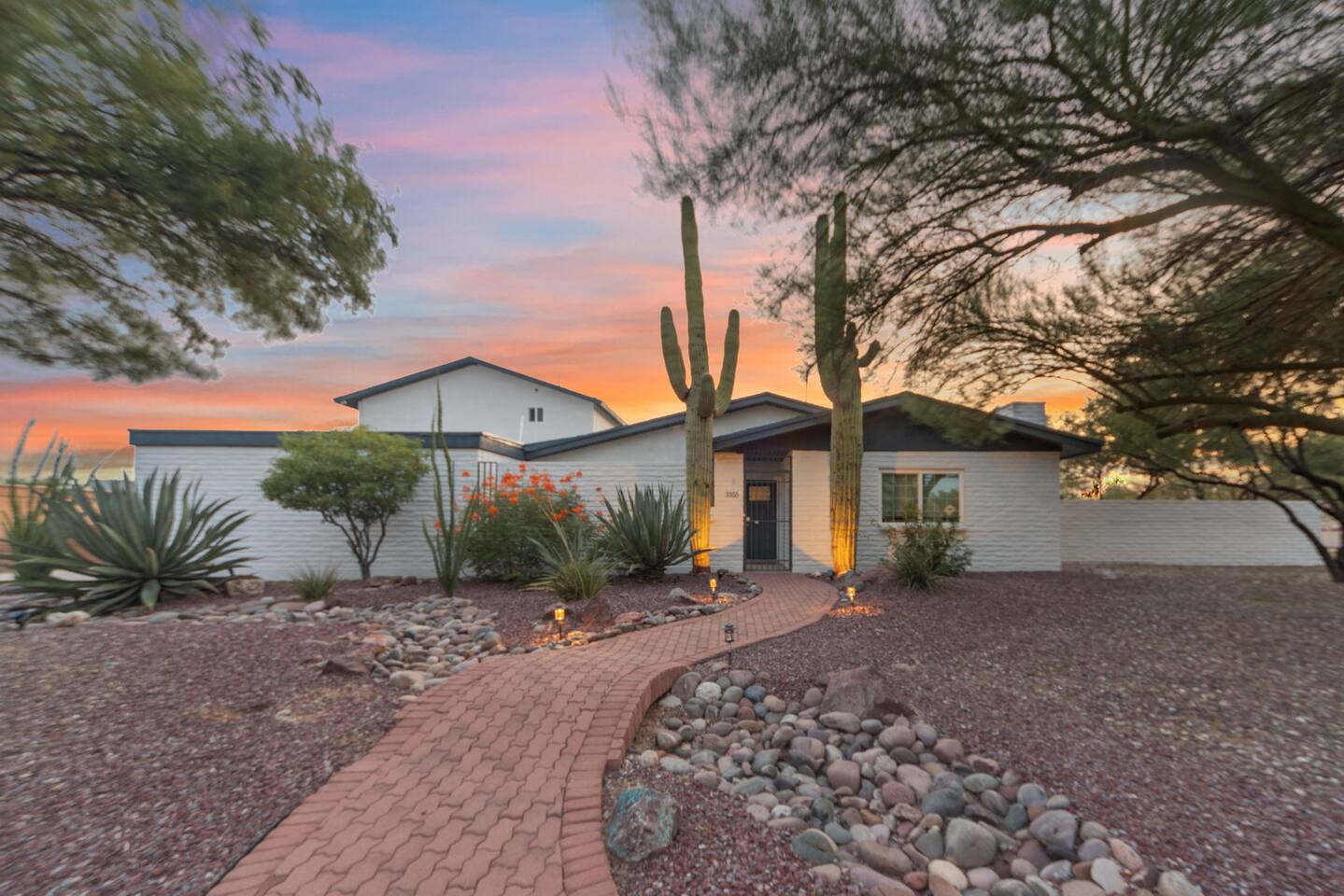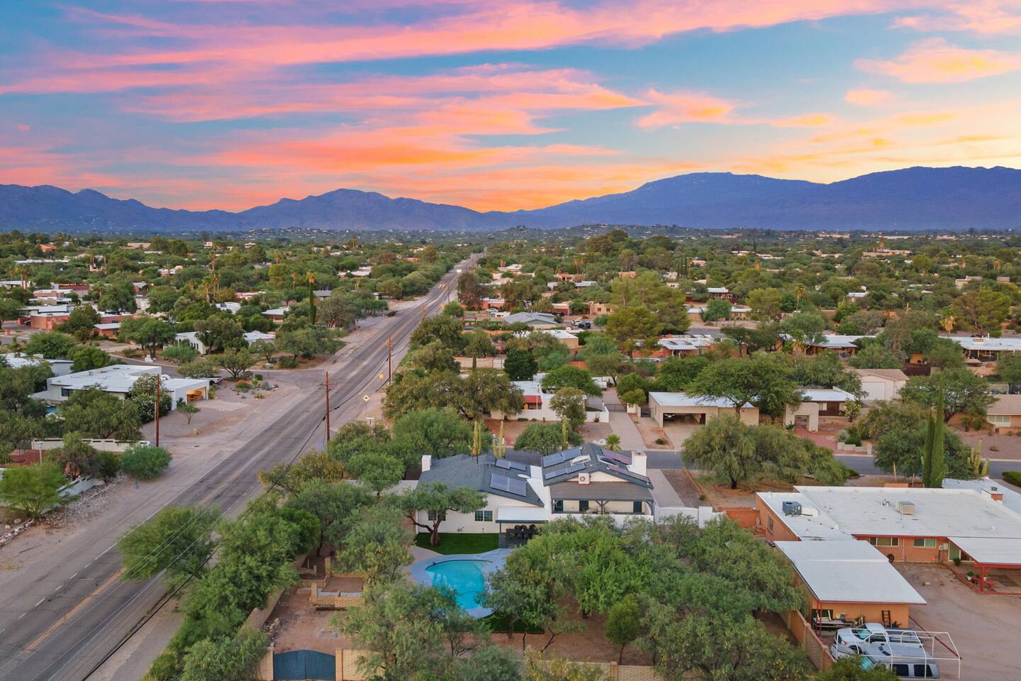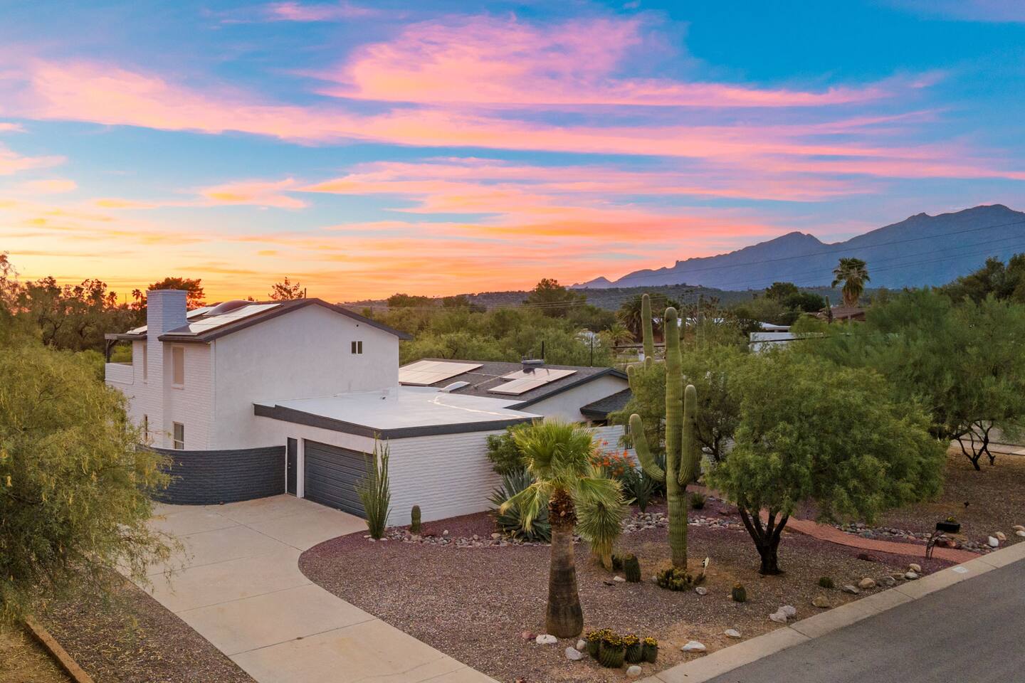 Welcome to our beautifully designed home in the heart of the Sabino Canyon area, located conveniently at the major cross streets of E Cloud Rd and N Sabino Canyon Rd. This home, crafted with comfort and style by a local interior designer, is perfect for larger groups and families seeking a memorable stay in Tucson. As you step inside, you'll be greeted by an open-concept living space that invites relaxation and fun. The living room features a comfortable sectional couch, a foosball table, board games, and a large TV, making it an ideal spot for both relaxation and entertainment. Adjacent to the living area is a modern dining space that comfortably seats six, perfect for family meals or gatherings. Just off the dining area, you'll find a pool table, adding to the home's entertainment options. The fully stocked kitchen is a chef's dream, equipped with everything you need to prepare delicious meals for your group. The home boasts six spacious bedrooms, each thoughtfully designed with your comfort in mind. The master bedroom, located upstairs for added privacy, is a true retreat. It features a king-sized bed, a cozy seating area, and ample space perfect for morning yoga. The two large skylights in the master bedroom allow you to wake up naturally with the sunrise, and you can enjoy your morning coffee on the private balcony. Bedrooms two and three each offer a king-sized bed for ultimate comfort, while bedrooms four and five are furnished with queen-sized beds. The sixth bedroom is perfect for kids or larger groups, with two bunk beds providing four single sleeping areas, a pull-out couch, and a vintage Pac-Man arcade game for endless fun. Outside, the home continues to impress with a beautiful large pool and a firepit, perfect for summer nights or chilly winter evenings. Whether you're looking to relax, entertain, or explore the beautiful surroundings of Sabino Canyon, this home provides the perfect setting for your stay in Tucson.Welcome to our beautifully designed home in the heart of the Sabino Canyon area, located conveniently at the major cross streets of E Cloud Rd and N Sabino Canyon Rd. This home, crafted with comfort and style by a local interior designer, is perfect for larger groups and families seeking a memorable stay in Tucson. As you step inside, you'll be greeted by an open-concept living space that invites relaxation and fun. The living room features a comfortable sectional couch, a foosball table, board games, and a large TV, making it an ideal spot for both relaxation and entertainment. Adjacent to the living area is a modern dining space that comfortably seats six, perfect for family meals or gatherings. Just off the dining area, you'll find a pool table, adding to the home's entertainment options. The fully stocked kitchen is a chef's dream, equipped with everything you need to prepare delicious meals for your group. The home boasts six spacious bedrooms, each thoughtfully designed with your comfort in mind. The master bedroom, located upstairs for added privacy, is a true retreat. It features a king-sized bed, a cozy seating area, and ample space perfect for morning yoga. The two large skylights in the master bedroom allow you to wake up naturally with the sunrise, and you can enjoy your morning coffee on the private balcony. Bedrooms two and three each offer a king-sized bed for ultimate comfort, while bedrooms four and five are furnished with queen-sized beds. The sixth bedroom is perfect for kids or larger groups, with two bunk beds providing four single sleeping areas, a pull-out couch, and a vintage Pac-Man arcade game for endless fun. Outside, the home continues to impress with a beautiful large pool. Whether you're looking to relax, entertain, or explore the beautiful surroundings of Sabino Canyon, this home provides the perfect setting for your stay in Tucson.