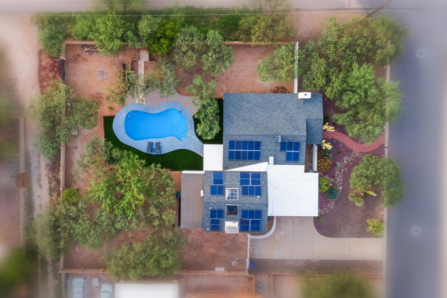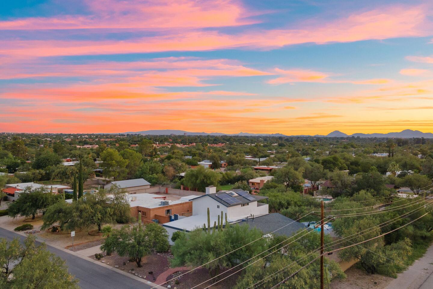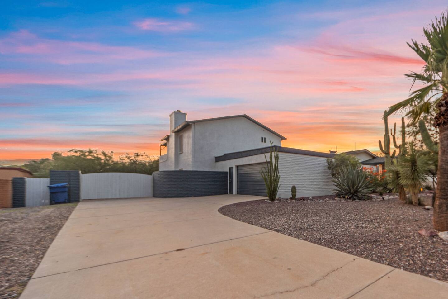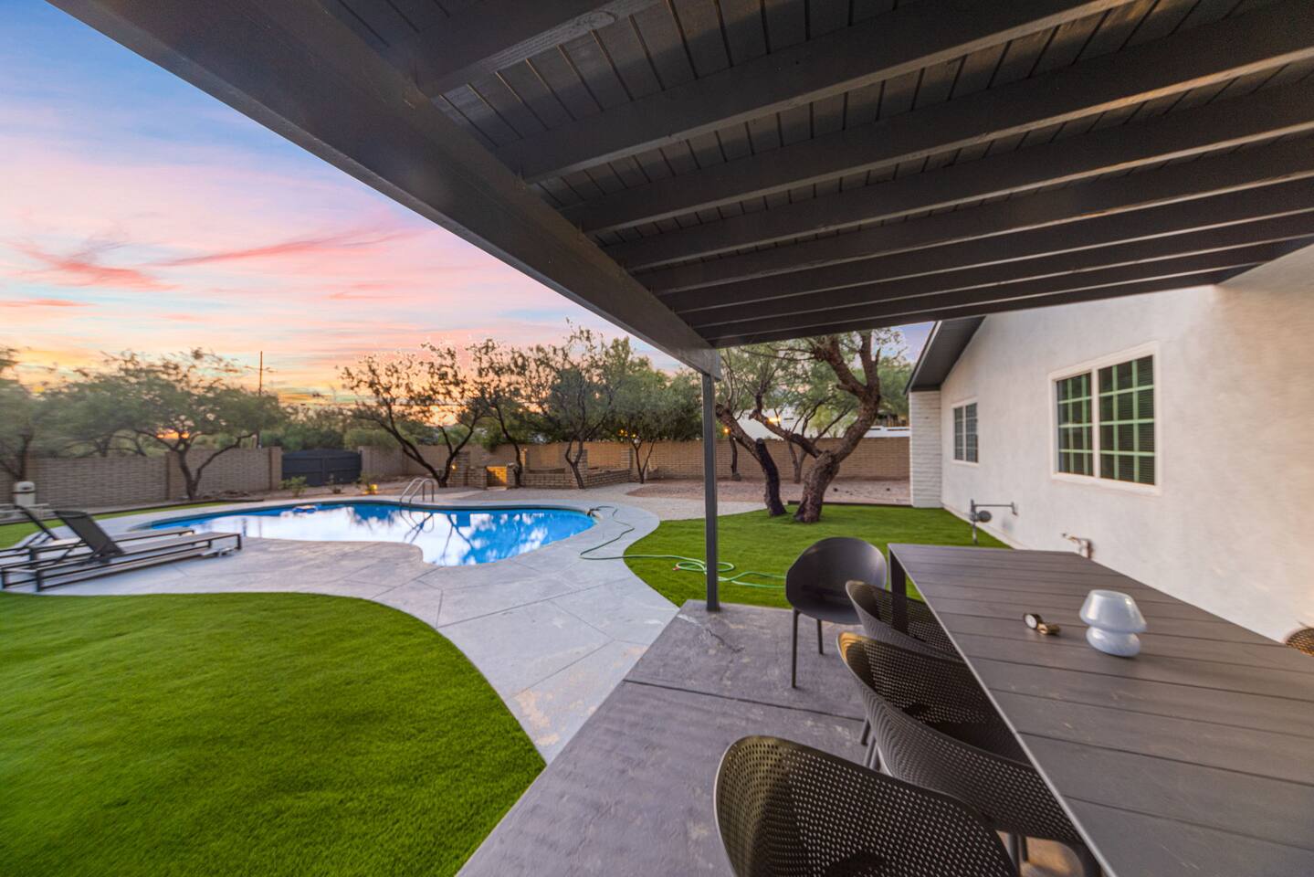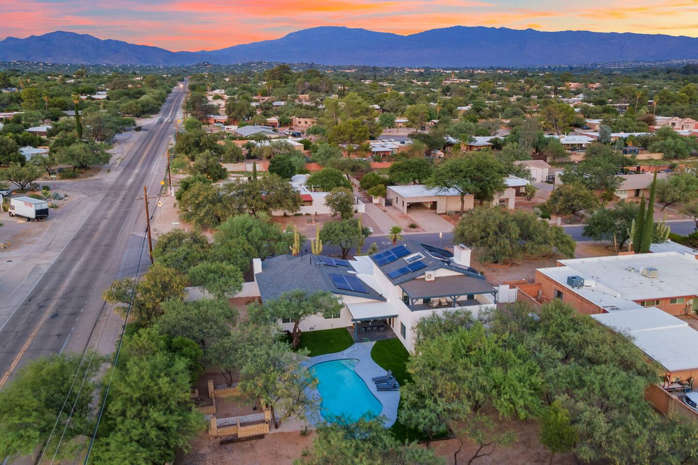 Welcome to our beautifully designed home in the heart of the Sabino Canyon area, located conveniently at the major cross streets of E Cloud Rd and N Sabino Canyon Rd. This home, crafted with comfort and style by a local interior designer, is perfect for larger groups and families seeking a memorable stay in Tucson. As you step inside, you'll be greeted by an open-concept living space that invites relaxation and fun. The living room features a comfortable sectional couch, a foosball table, board games, and a large TV, making it an ideal spot for both relaxation and entertainment. Adjacent to the living area is a modern dining space that comfortably seats six, perfect for family meals or gatherings. Just off the dining area, you'll find a pool table, adding to the home's entertainment options. The fully stocked kitchen is a chef's dream, equipped with everything you need to prepare delicious meals for your group. The home boasts six spacious bedrooms, each thoughtfully designed with your comfort in mind. The master bedroom, located upstairs for added privacy, is a true retreat. It features a king-sized bed, a cozy seating area, and ample space perfect for morning yoga. The two large skylights in the master bedroom allow you to wake up naturally with the sunrise, and you can enjoy your morning coffee on the private balcony. Bedrooms two and three each offer a king-sized bed for ultimate comfort, while bedrooms four and five are furnished with queen-sized beds. The sixth bedroom is perfect for kids or larger groups, with two bunk beds providing four single sleeping areas, a pull-out couch, and a vintage Pac-Man arcade game for endless fun. Outside, the home continues to impress with a beautiful large pool and a firepit, perfect for summer nights or chilly winter evenings. Whether you're looking to relax, entertain, or explore the beautiful surroundings of Sabino Canyon, this home provides the perfect setting for your stay in Tucson.Welcome to our beautifully designed home in the heart of the Sabino Canyon area, located conveniently at the major cross streets of E Cloud Rd and N Sabino Canyon Rd. This home, crafted with comfort and style by a local interior designer, is perfect for larger groups and families seeking a memorable stay in Tucson. As you step inside, you'll be greeted by an open-concept living space that invites relaxation and fun. The living room features a comfortable sectional couch, a foosball table, board games, and a large TV, making it an ideal spot for both relaxation and entertainment. Adjacent to the living area is a modern dining space that comfortably seats six, perfect for family meals or gatherings. Just off the dining area, you'll find a pool table, adding to the home's entertainment options. The fully stocked kitchen is a chef's dream, equipped with everything you need to prepare delicious meals for your group. The home boasts six spacious bedrooms, each thoughtfully designed with your comfort in mind. The master bedroom, located upstairs for added privacy, is a true retreat. It features a king-sized bed, a cozy seating area, and ample space perfect for morning yoga. The two large skylights in the master bedroom allow you to wake up naturally with the sunrise, and you can enjoy your morning coffee on the private balcony. Bedrooms two and three each offer a king-sized bed for ultimate comfort, while bedrooms four and five are furnished with queen-sized beds. The sixth bedroom is perfect for kids or larger groups, with two bunk beds providing four single sleeping areas, a pull-out couch, and a vintage Pac-Man arcade game for endless fun. Outside, the home continues to impress with a beautiful large pool. Whether you're looking to relax, entertain, or explore the beautiful surroundings of Sabino Canyon, this home provides the perfect setting for your stay in Tucson.