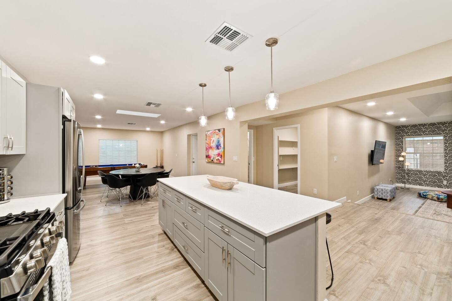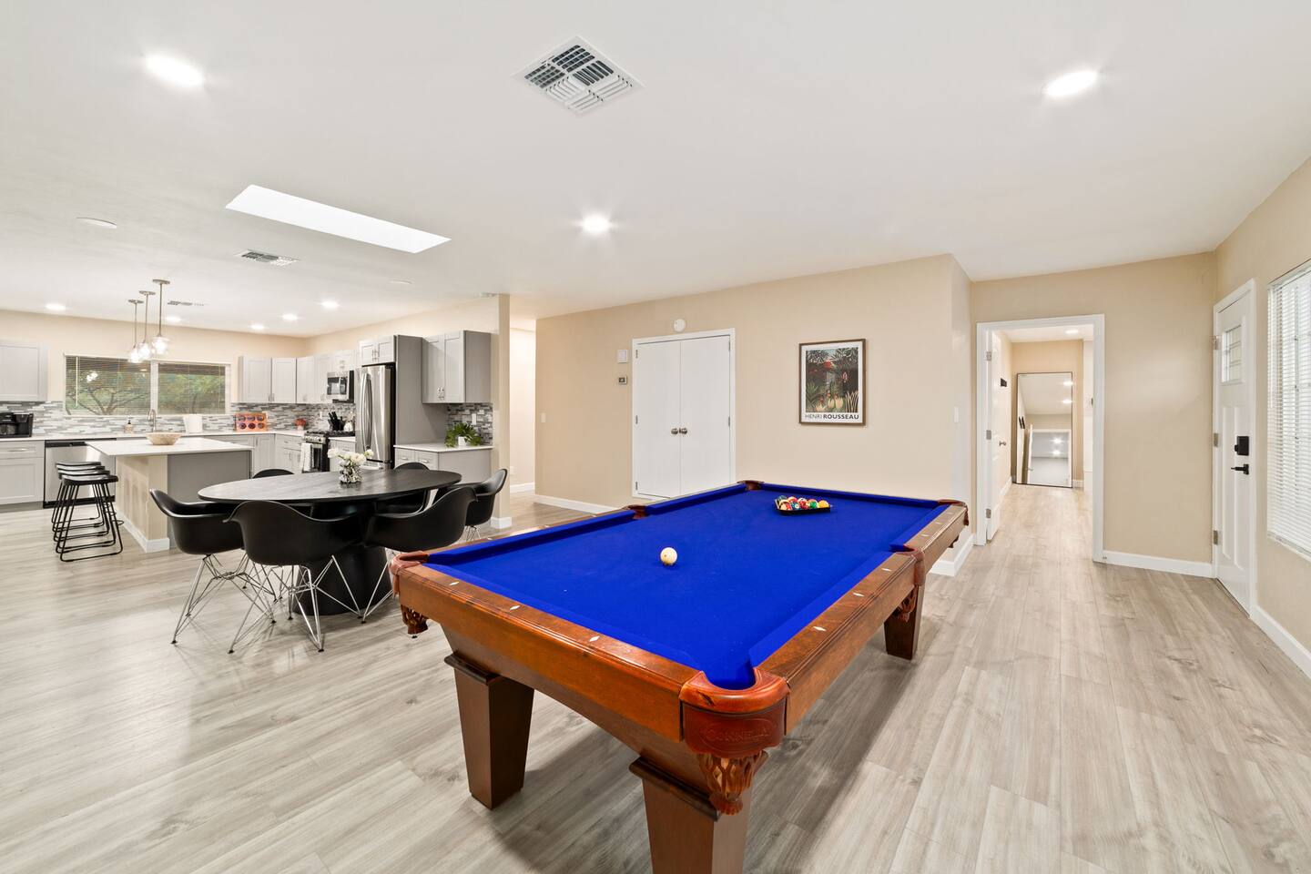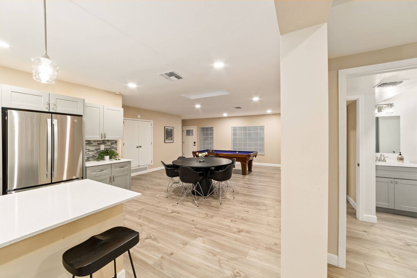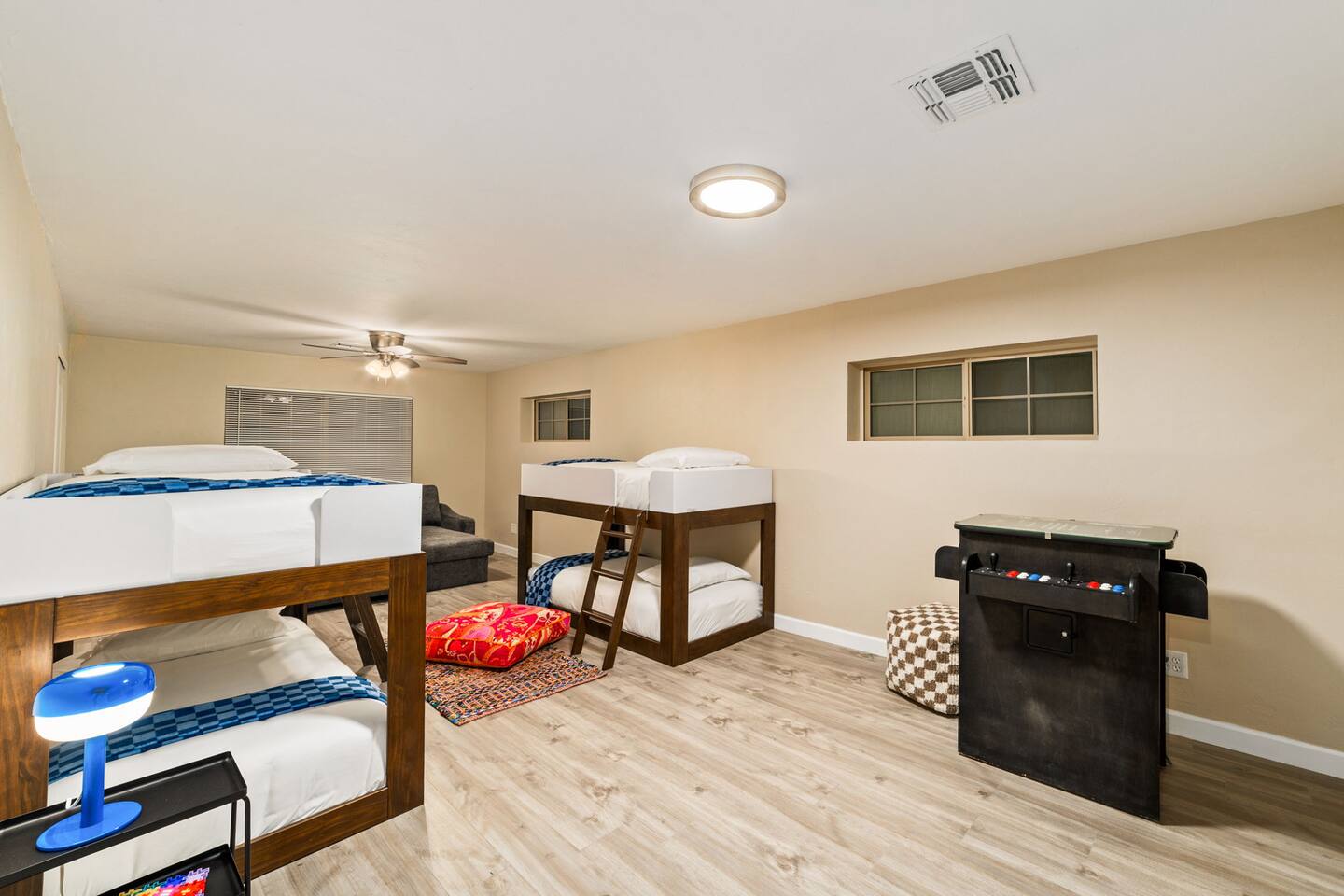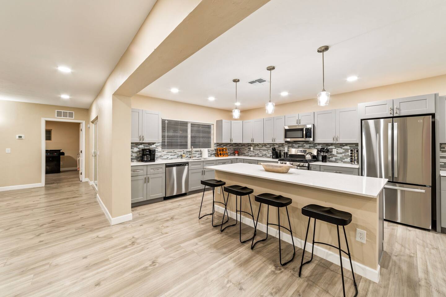 Welcome to our beautifully designed home in the heart of the Sabino Canyon area, located conveniently at the major cross streets of E Cloud Rd and N Sabino Canyon Rd. This home, crafted with comfort and style by a local interior designer, is perfect for larger groups and families seeking a memorable stay in Tucson. As you step inside, you'll be greeted by an open-concept living space that invites relaxation and fun. The living room features a comfortable sectional couch, a foosball table, board games, and a large TV, making it an ideal spot for both relaxation and entertainment. Adjacent to the living area is a modern dining space that comfortably seats six, perfect for family meals or gatherings. Just off the dining area, you'll find a pool table, adding to the home's entertainment options. The fully stocked kitchen is a chef's dream, equipped with everything you need to prepare delicious meals for your group. The home boasts six spacious bedrooms, each thoughtfully designed with your comfort in mind. The master bedroom, located upstairs for added privacy, is a true retreat. It features a king-sized bed, a cozy seating area, and ample space perfect for morning yoga. The two large skylights in the master bedroom allow you to wake up naturally with the sunrise, and you can enjoy your morning coffee on the private balcony. Bedrooms two and three each offer a king-sized bed for ultimate comfort, while bedrooms four and five are furnished with queen-sized beds. The sixth bedroom is perfect for kids or larger groups, with two bunk beds providing four single sleeping areas, a pull-out couch, and a vintage Pac-Man arcade game for endless fun. Outside, the home continues to impress with a beautiful large pool and a firepit, perfect for summer nights or chilly winter evenings. Whether you're looking to relax, entertain, or explore the beautiful surroundings of Sabino Canyon, this home provides the perfect setting for your stay in Tucson.Welcome to our beautifully designed home in the heart of the Sabino Canyon area, located conveniently at the major cross streets of E Cloud Rd and N Sabino Canyon Rd. This home, crafted with comfort and style by a local interior designer, is perfect for larger groups and families seeking a memorable stay in Tucson. As you step inside, you'll be greeted by an open-concept living space that invites relaxation and fun. The living room features a comfortable sectional couch, a foosball table, board games, and a large TV, making it an ideal spot for both relaxation and entertainment. Adjacent to the living area is a modern dining space that comfortably seats six, perfect for family meals or gatherings. Just off the dining area, you'll find a pool table, adding to the home's entertainment options. The fully stocked kitchen is a chef's dream, equipped with everything you need to prepare delicious meals for your group. The home boasts six spacious bedrooms, each thoughtfully designed with your comfort in mind. The master bedroom, located upstairs for added privacy, is a true retreat. It features a king-sized bed, a cozy seating area, and ample space perfect for morning yoga. The two large skylights in the master bedroom allow you to wake up naturally with the sunrise, and you can enjoy your morning coffee on the private balcony. Bedrooms two and three each offer a king-sized bed for ultimate comfort, while bedrooms four and five are furnished with queen-sized beds. The sixth bedroom is perfect for kids or larger groups, with two bunk beds providing four single sleeping areas, a pull-out couch, and a vintage Pac-Man arcade game for endless fun. Outside, the home continues to impress with a beautiful large pool. Whether you're looking to relax, entertain, or explore the beautiful surroundings of Sabino Canyon, this home provides the perfect setting for your stay in Tucson.