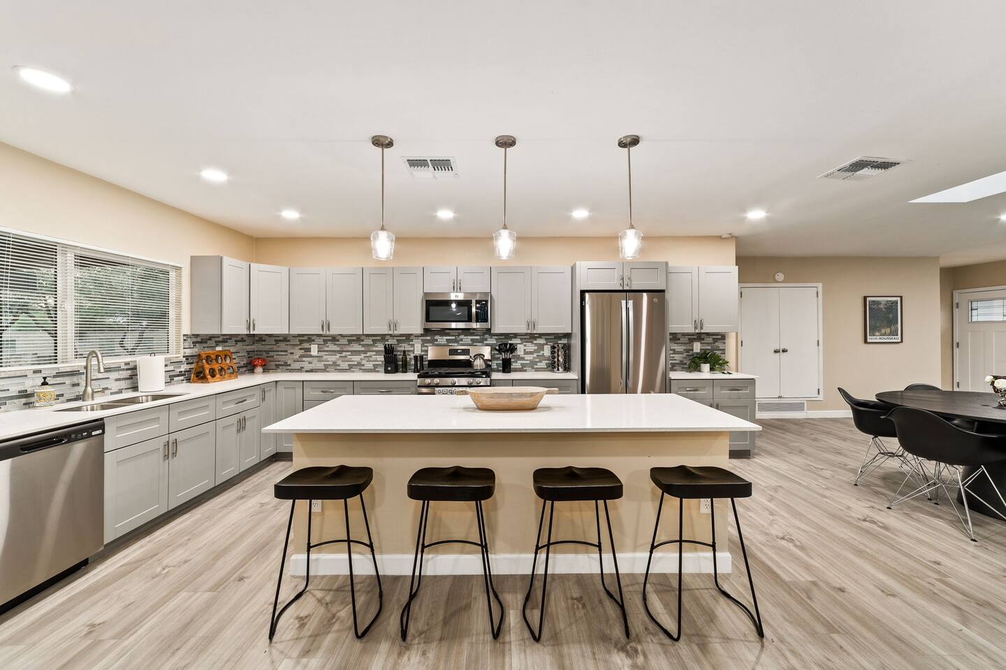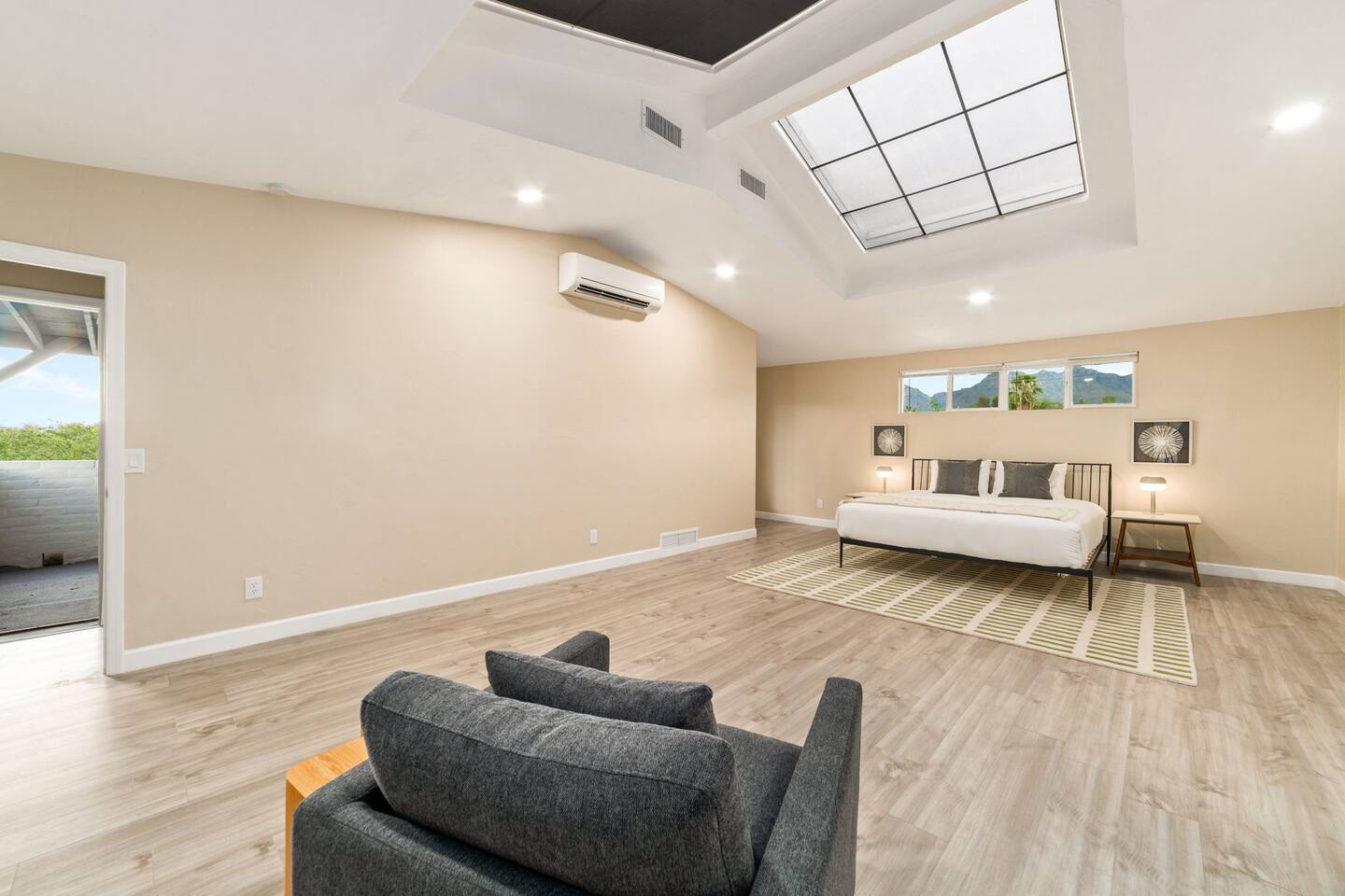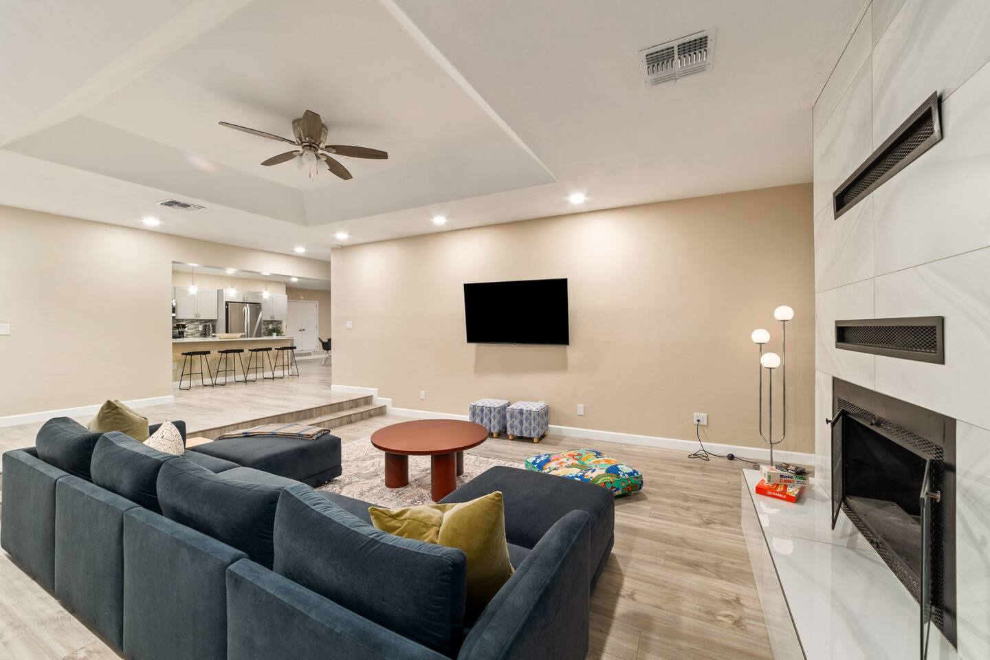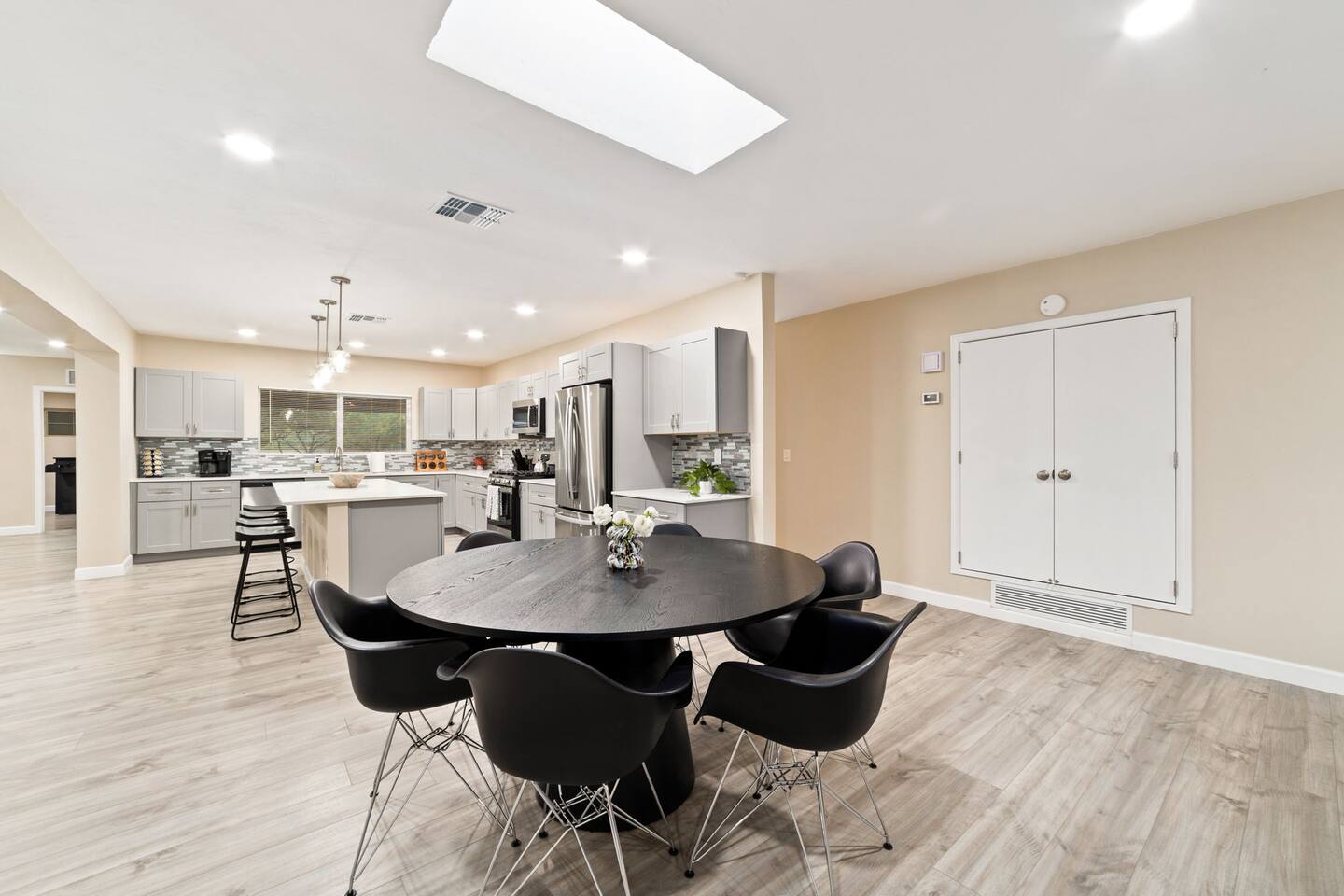 Welcome to our beautifully designed home in the heart of the Sabino Canyon area, located conveniently at the major cross streets of E Cloud Rd and N Sabino Canyon Rd. This home, crafted with comfort and style by a local interior designer, is perfect for larger groups and families seeking a memorable stay in Tucson. As you step inside, you'll be greeted by an open-concept living space that invites relaxation and fun. The living room features a comfortable sectional couch, a foosball table, board games, and a large TV, making it an ideal spot for both relaxation and entertainment. Adjacent to the living area is a modern dining space that comfortably seats six, perfect for family meals or gatherings. Just off the dining area, you'll find a pool table, adding to the home's entertainment options. The fully stocked kitchen is a chef's dream, equipped with everything you need to prepare delicious meals for your group. The home boasts six spacious bedrooms, each thoughtfully designed with your comfort in mind. The master bedroom, located upstairs for added privacy, is a true retreat. It features a king-sized bed, a cozy seating area, and ample space perfect for morning yoga. The two large skylights in the master bedroom allow you to wake up naturally with the sunrise, and you can enjoy your morning coffee on the private balcony. Bedrooms two and three each offer a king-sized bed for ultimate comfort, while bedrooms four and five are furnished with queen-sized beds. The sixth bedroom is perfect for kids or larger groups, with two bunk beds providing four single sleeping areas, a pull-out couch, and a vintage Pac-Man arcade game for endless fun. Outside, the home continues to impress with a beautiful large pool and a firepit, perfect for summer nights or chilly winter evenings. Whether you're looking to relax, entertain, or explore the beautiful surroundings of Sabino Canyon, this home provides the perfect setting for your stay in Tucson.Welcome to our beautifully designed home in the heart of the Sabino Canyon area, located conveniently at the major cross streets of E Cloud Rd and N Sabino Canyon Rd. This home, crafted with comfort and style by a local interior designer, is perfect for larger groups and families seeking a memorable stay in Tucson. As you step inside, you'll be greeted by an open-concept living space that invites relaxation and fun. The living room features a comfortable sectional couch, a foosball table, board games, and a large TV, making it an ideal spot for both relaxation and entertainment. Adjacent to the living area is a modern dining space that comfortably seats six, perfect for family meals or gatherings. Just off the dining area, you'll find a pool table, adding to the home's entertainment options. The fully stocked kitchen is a chef's dream, equipped with everything you need to prepare delicious meals for your group. The home boasts six spacious bedrooms, each thoughtfully designed with your comfort in mind. The master bedroom, located upstairs for added privacy, is a true retreat. It features a king-sized bed, a cozy seating area, and ample space perfect for morning yoga. The two large skylights in the master bedroom allow you to wake up naturally with the sunrise, and you can enjoy your morning coffee on the private balcony. Bedrooms two and three each offer a king-sized bed for ultimate comfort, while bedrooms four and five are furnished with queen-sized beds. The sixth bedroom is perfect for kids or larger groups, with two bunk beds providing four single sleeping areas, a pull-out couch, and a vintage Pac-Man arcade game for endless fun. Outside, the home continues to impress with a beautiful large pool. Whether you're looking to relax, entertain, or explore the beautiful surroundings of Sabino Canyon, this home provides the perfect setting for your stay in Tucson.