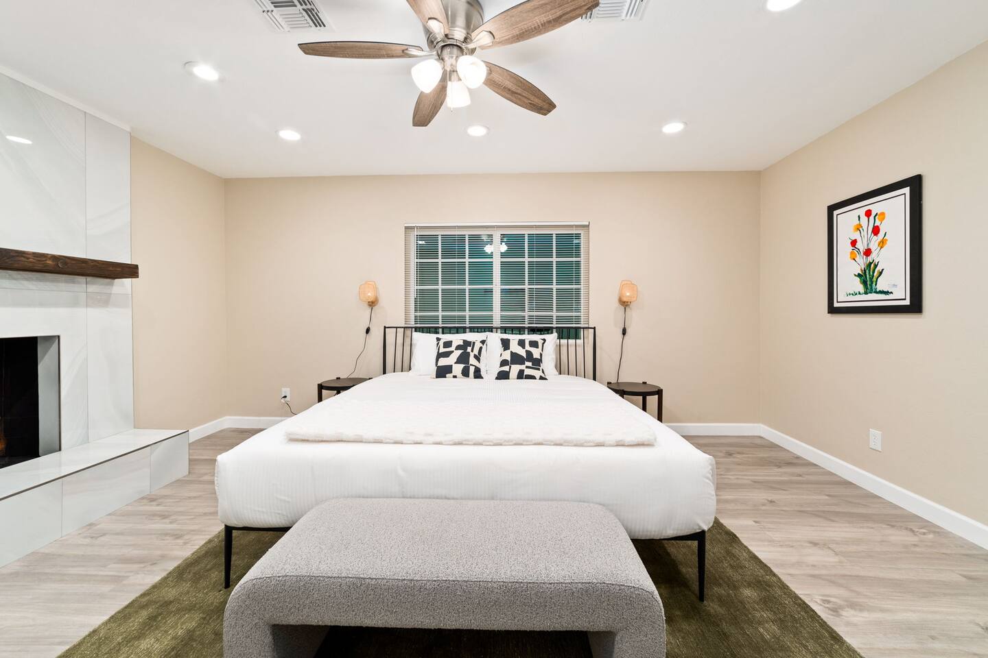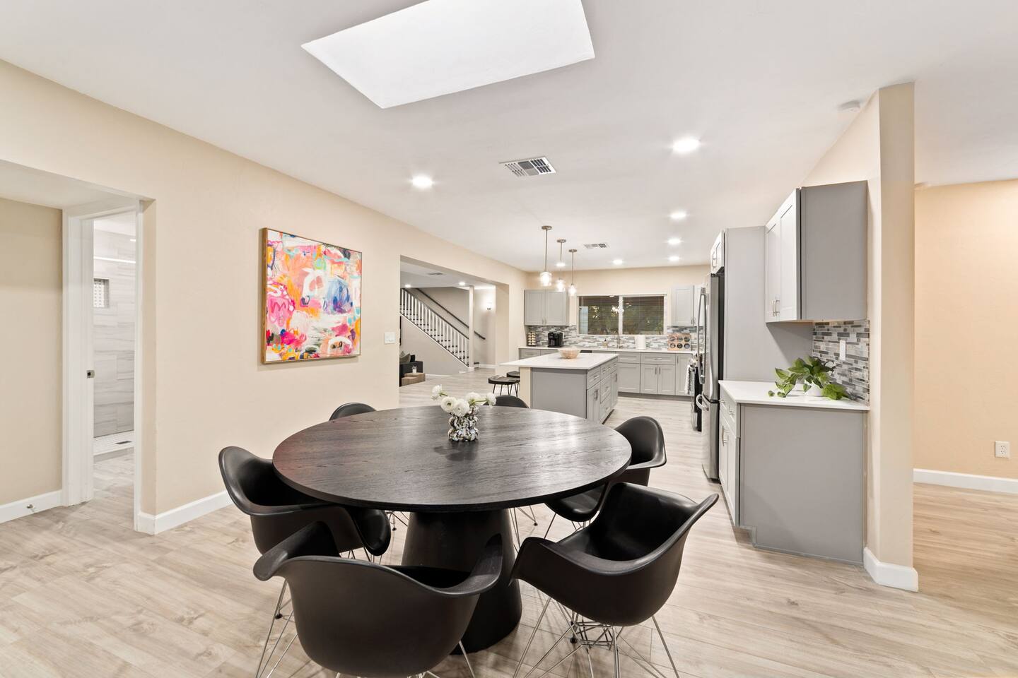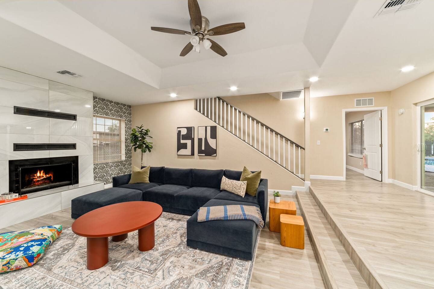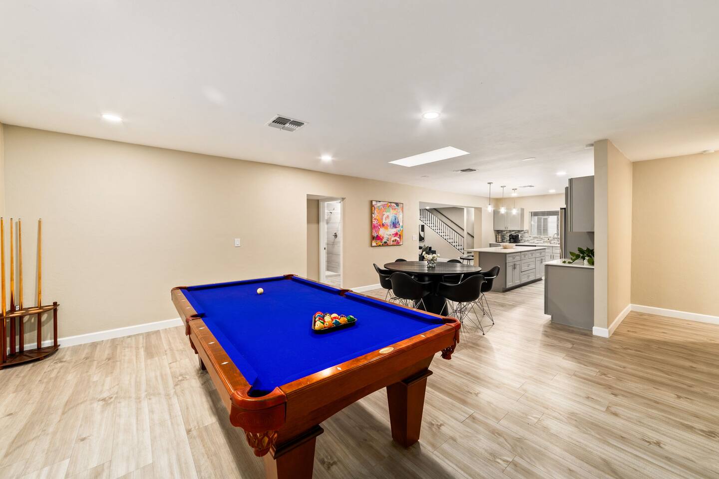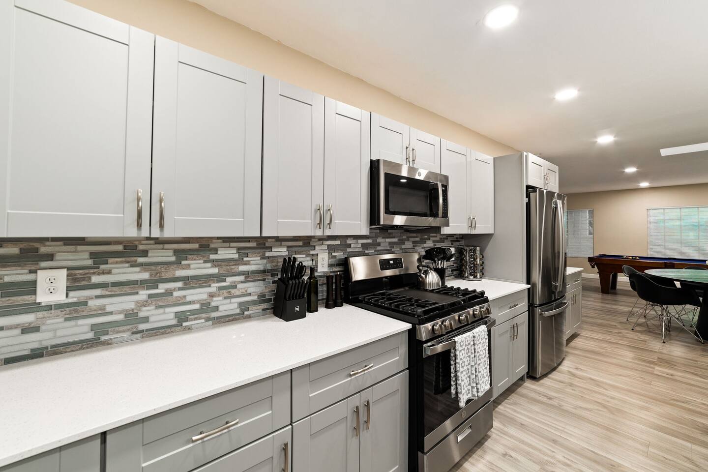 Welcome to our beautifully designed home in the heart of the Sabino Canyon area, located conveniently at the major cross streets of E Cloud Rd and N Sabino Canyon Rd. This home, crafted with comfort and style by a local interior designer, is perfect for larger groups and families seeking a memorable stay in Tucson. As you step inside, you'll be greeted by an open-concept living space that invites relaxation and fun. The living room features a comfortable sectional couch, a foosball table, board games, and a large TV, making it an ideal spot for both relaxation and entertainment. Adjacent to the living area is a modern dining space that comfortably seats six, perfect for family meals or gatherings. Just off the dining area, you'll find a pool table, adding to the home's entertainment options. The fully stocked kitchen is a chef's dream, equipped with everything you need to prepare delicious meals for your group. The home boasts six spacious bedrooms, each thoughtfully designed with your comfort in mind. The master bedroom, located upstairs for added privacy, is a true retreat. It features a king-sized bed, a cozy seating area, and ample space perfect for morning yoga. The two large skylights in the master bedroom allow you to wake up naturally with the sunrise, and you can enjoy your morning coffee on the private balcony. Bedrooms two and three each offer a king-sized bed for ultimate comfort, while bedrooms four and five are furnished with queen-sized beds. The sixth bedroom is perfect for kids or larger groups, with two bunk beds providing four single sleeping areas, a pull-out couch, and a vintage Pac-Man arcade game for endless fun. Outside, the home continues to impress with a beautiful large pool and a firepit, perfect for summer nights or chilly winter evenings. Whether you're looking to relax, entertain, or explore the beautiful surroundings of Sabino Canyon, this home provides the perfect setting for your stay in Tucson.Welcome to our beautifully designed home in the heart of the Sabino Canyon area, located conveniently at the major cross streets of E Cloud Rd and N Sabino Canyon Rd. This home, crafted with comfort and style by a local interior designer, is perfect for larger groups and families seeking a memorable stay in Tucson. As you step inside, you'll be greeted by an open-concept living space that invites relaxation and fun. The living room features a comfortable sectional couch, a foosball table, board games, and a large TV, making it an ideal spot for both relaxation and entertainment. Adjacent to the living area is a modern dining space that comfortably seats six, perfect for family meals or gatherings. Just off the dining area, you'll find a pool table, adding to the home's entertainment options. The fully stocked kitchen is a chef's dream, equipped with everything you need to prepare delicious meals for your group. The home boasts six spacious bedrooms, each thoughtfully designed with your comfort in mind. The master bedroom, located upstairs for added privacy, is a true retreat. It features a king-sized bed, a cozy seating area, and ample space perfect for morning yoga. The two large skylights in the master bedroom allow you to wake up naturally with the sunrise, and you can enjoy your morning coffee on the private balcony. Bedrooms two and three each offer a king-sized bed for ultimate comfort, while bedrooms four and five are furnished with queen-sized beds. The sixth bedroom is perfect for kids or larger groups, with two bunk beds providing four single sleeping areas, a pull-out couch, and a vintage Pac-Man arcade game for endless fun. Outside, the home continues to impress with a beautiful large pool. Whether you're looking to relax, entertain, or explore the beautiful surroundings of Sabino Canyon, this home provides the perfect setting for your stay in Tucson.