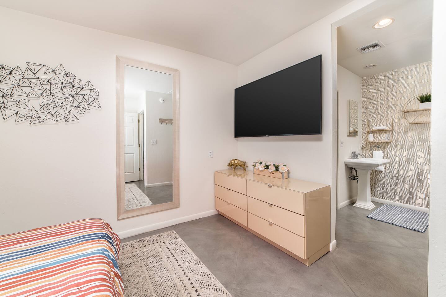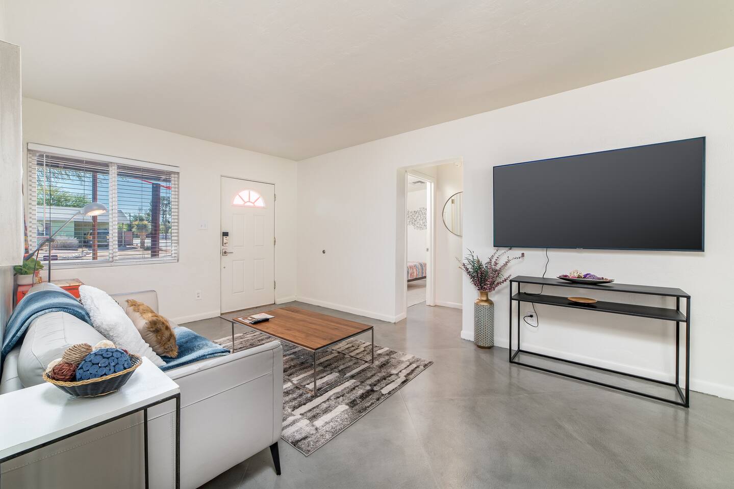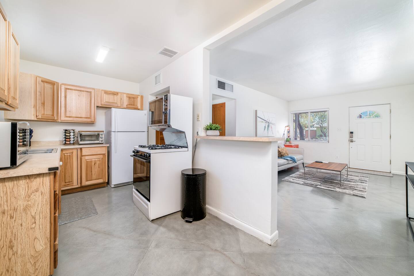 Modern Interior Design Close to the University and Shopping Concrete Floors Luxury Bedding Kitchen Necessities BBQ