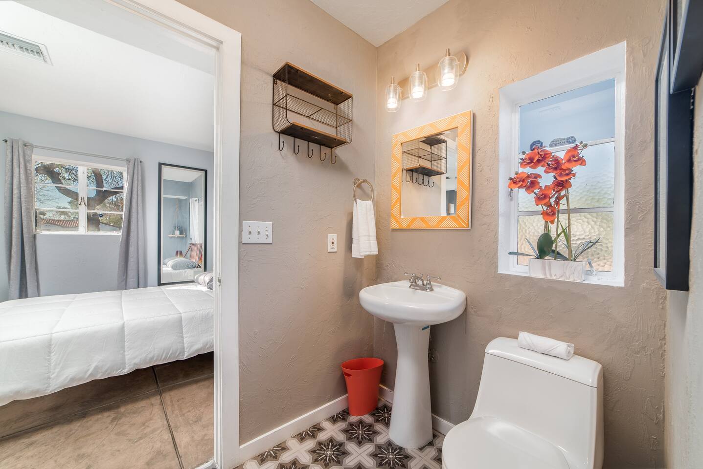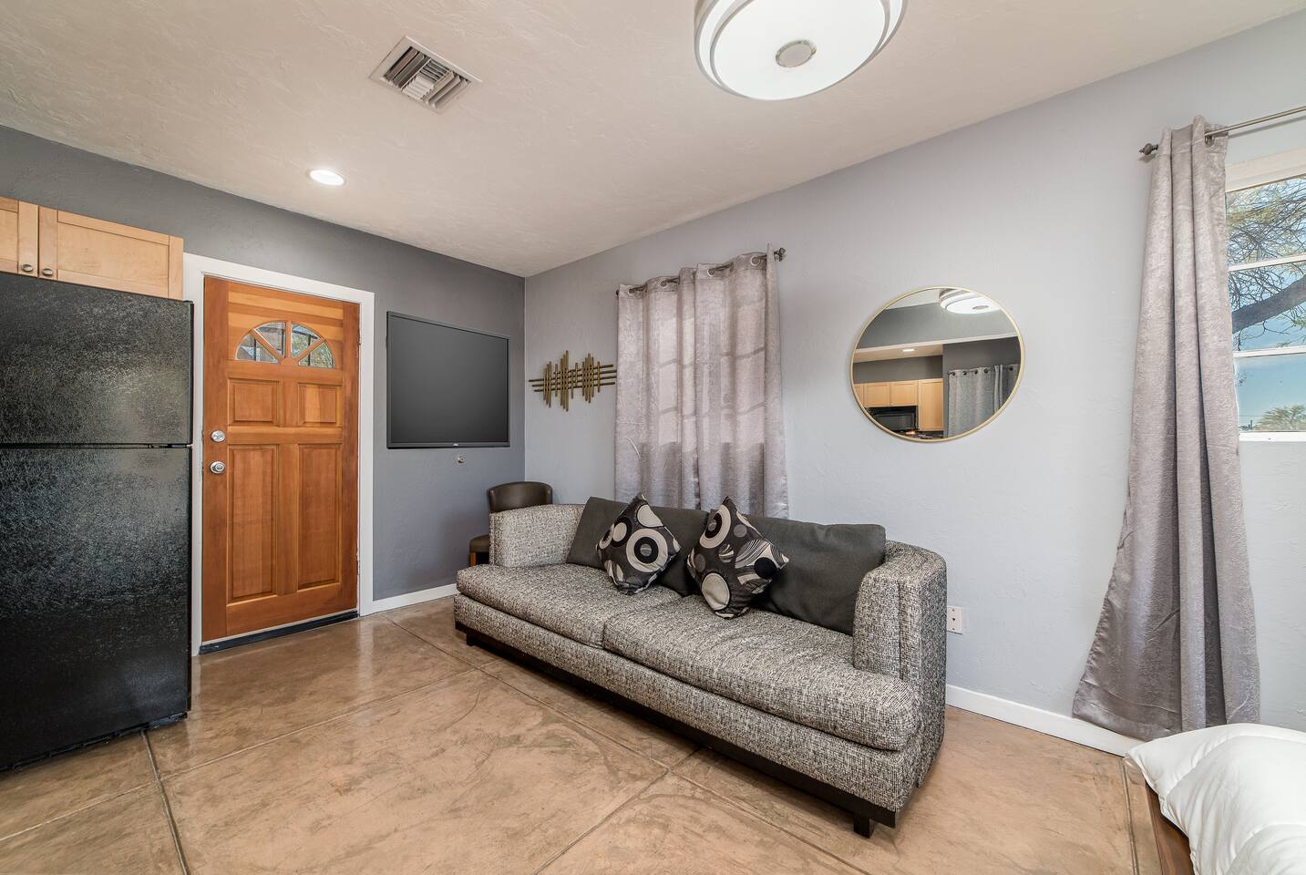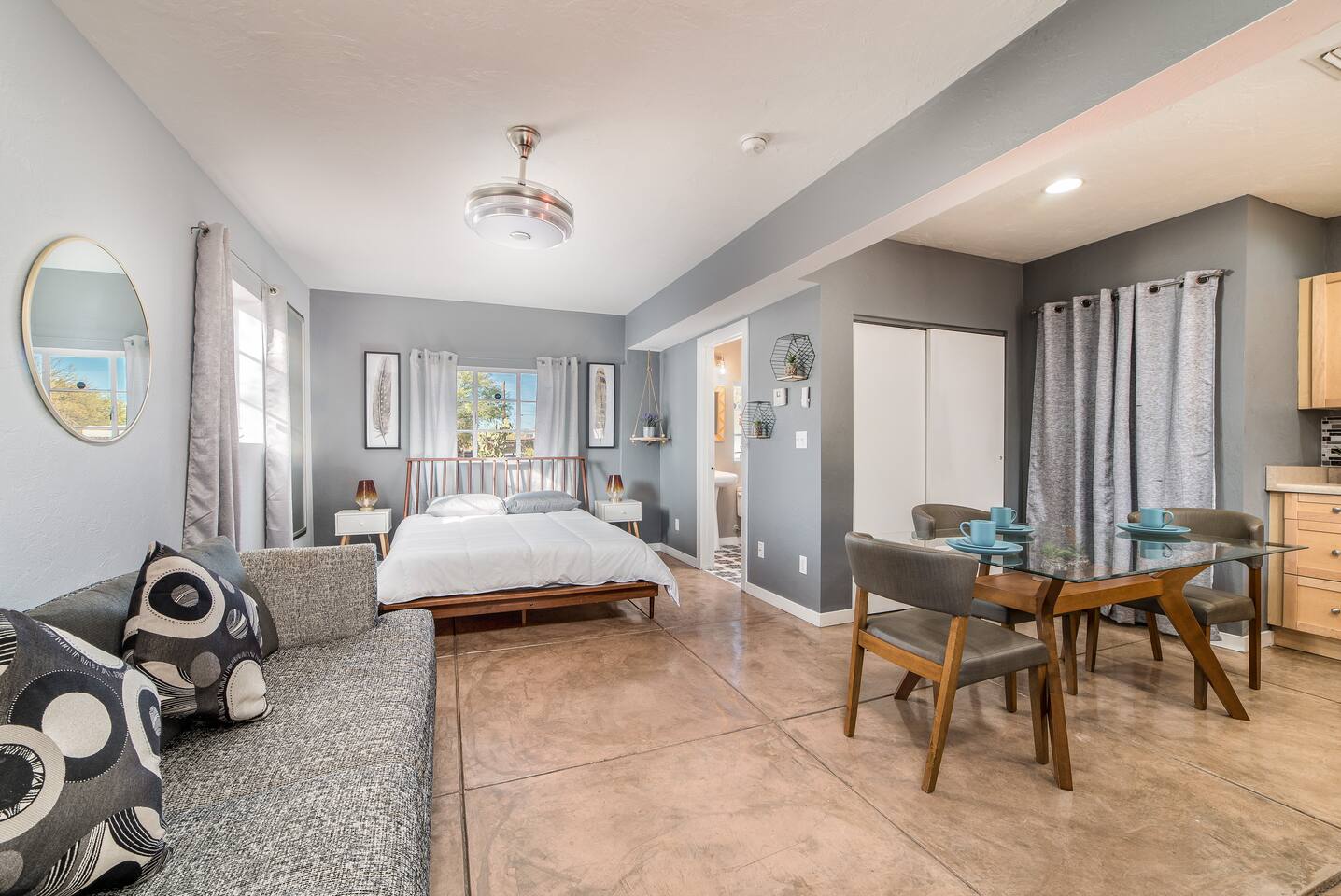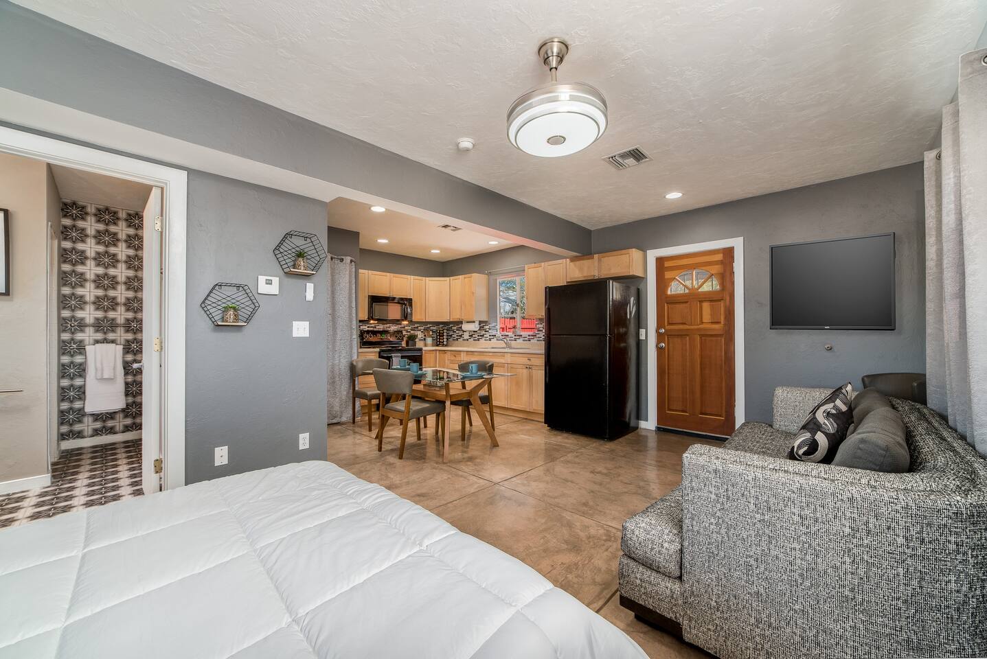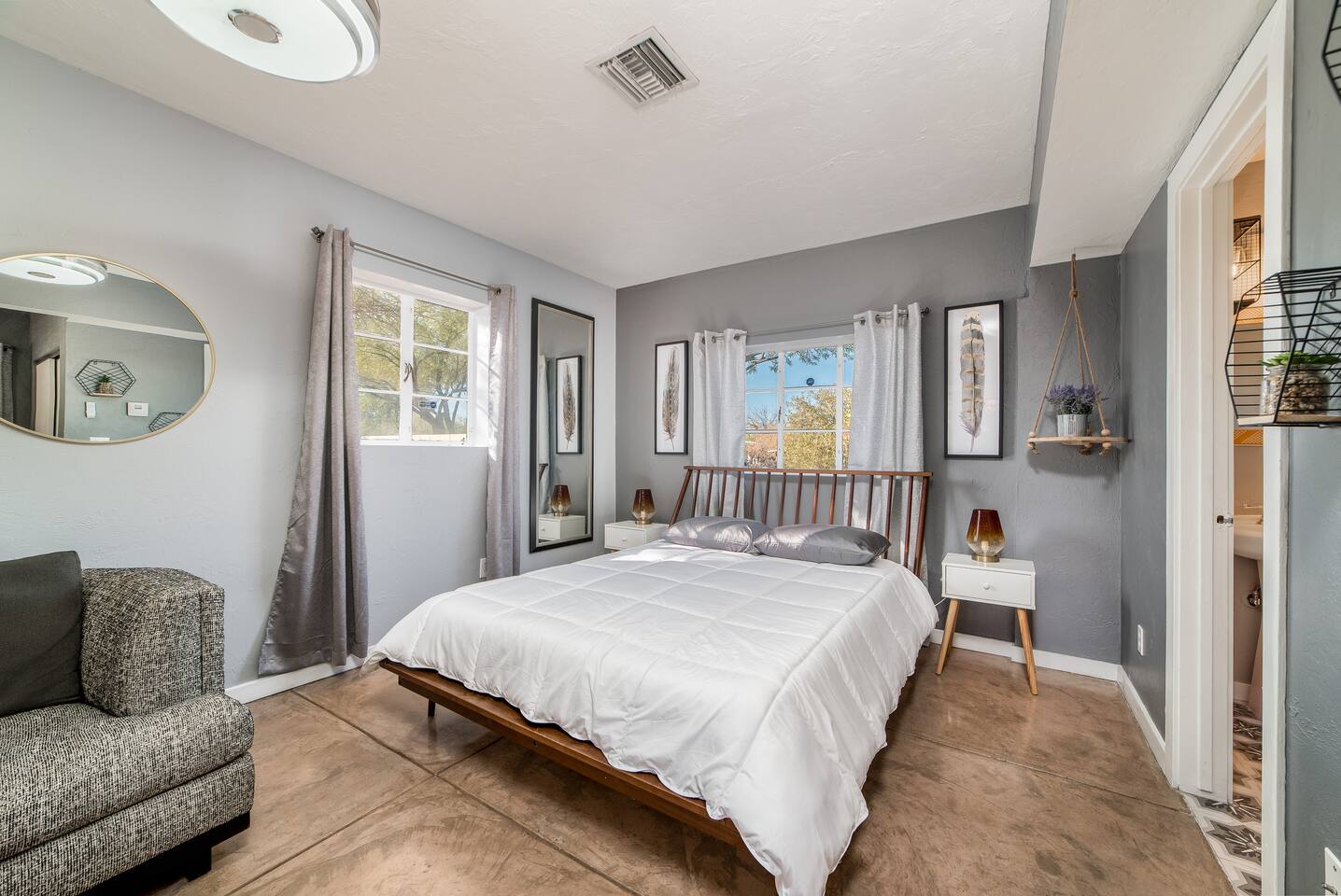Modern Bohemian Style Interior Design Close to the University and Shopping Concrete Floors Luxury Bedding Kitchen Necessities BBQ.