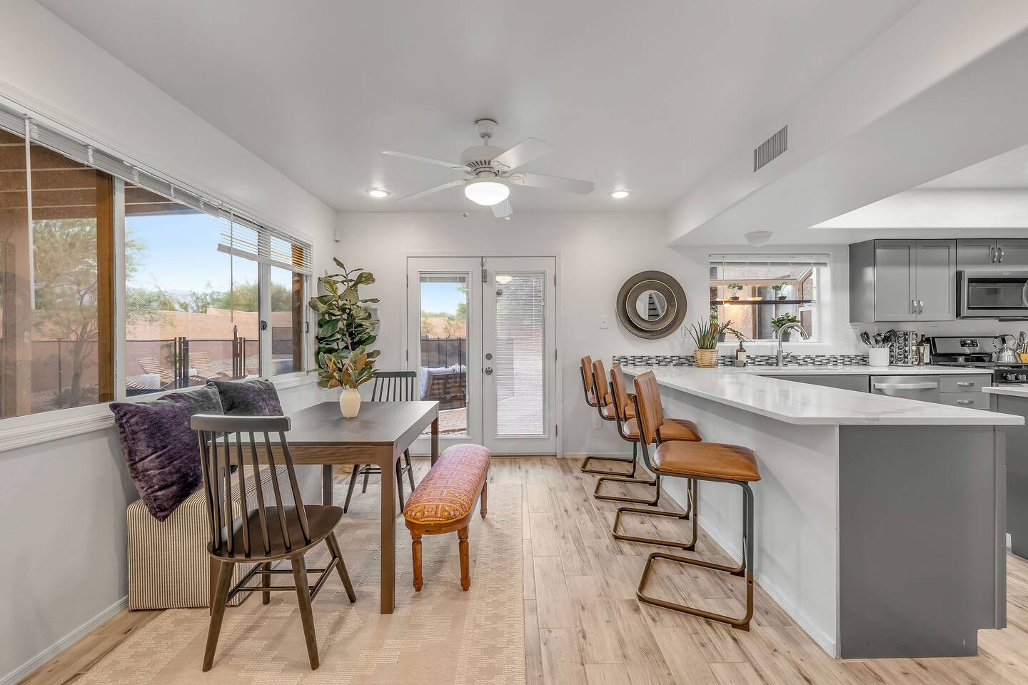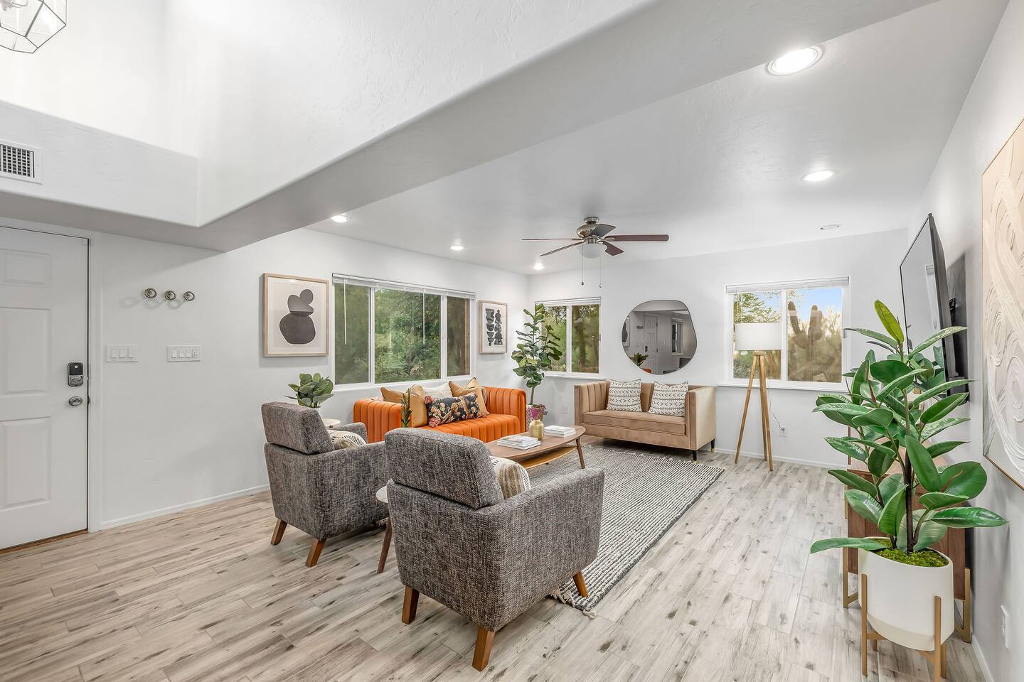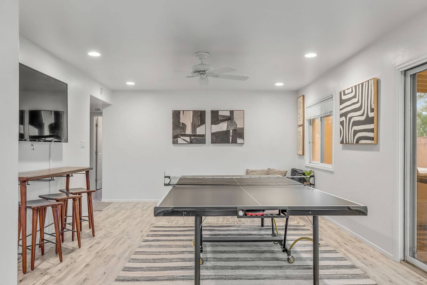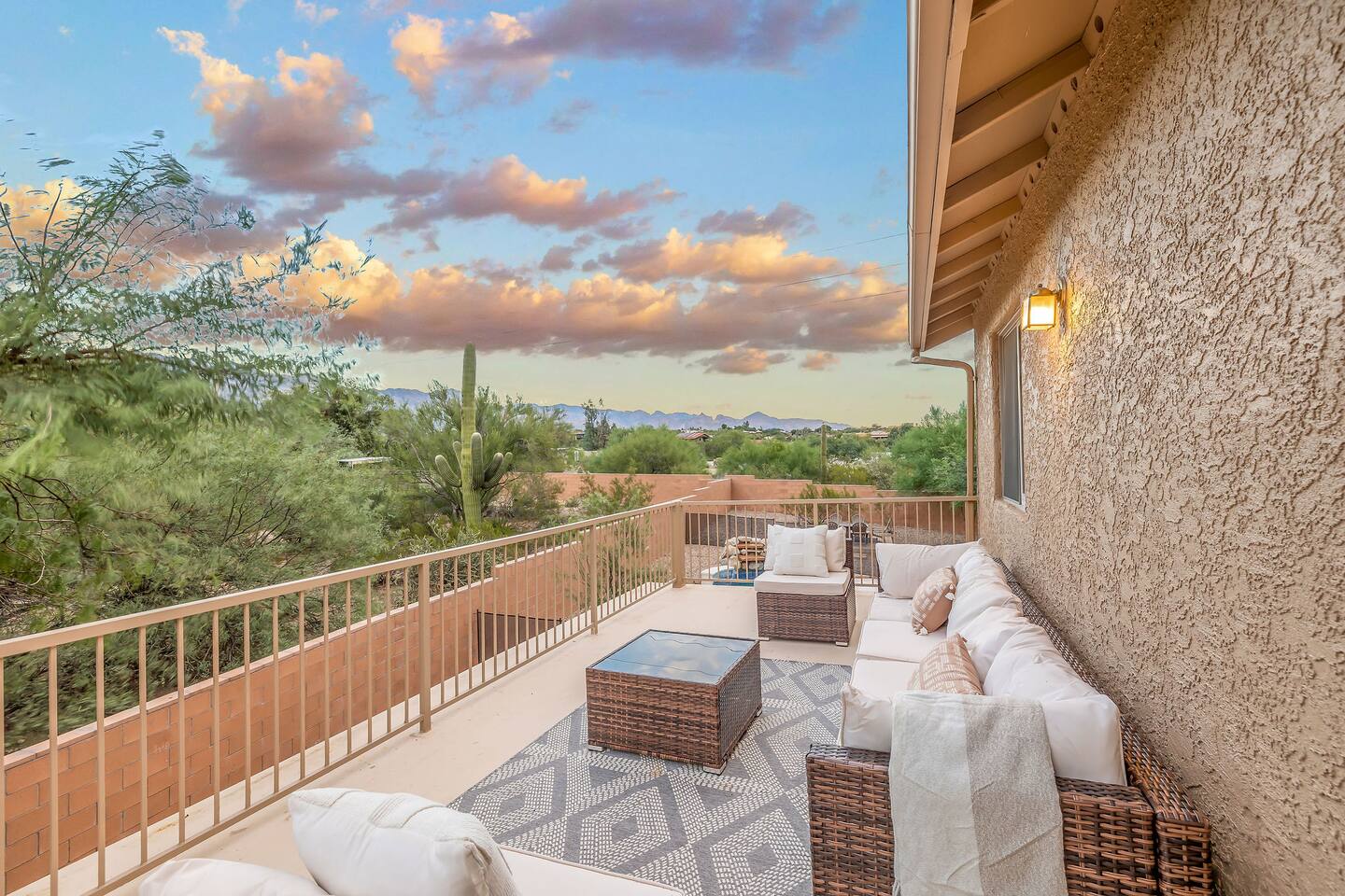 Stylish and fully-renovated home is a picture-perfect desert oasis. Spacious 5 bedroom/4 full baths, offers a breezy open concept living space, gorgeous oversized kitchen, game room with ping pong, and an additional office space upstairs. Beautifully landscaped backyard with an extended covered patio, balconies to take in the views, fire pit, and sparkling pool. Enjoy mountain views and privacy while only being minutes from premiere shopping, hiking, dining, and grocery stores.