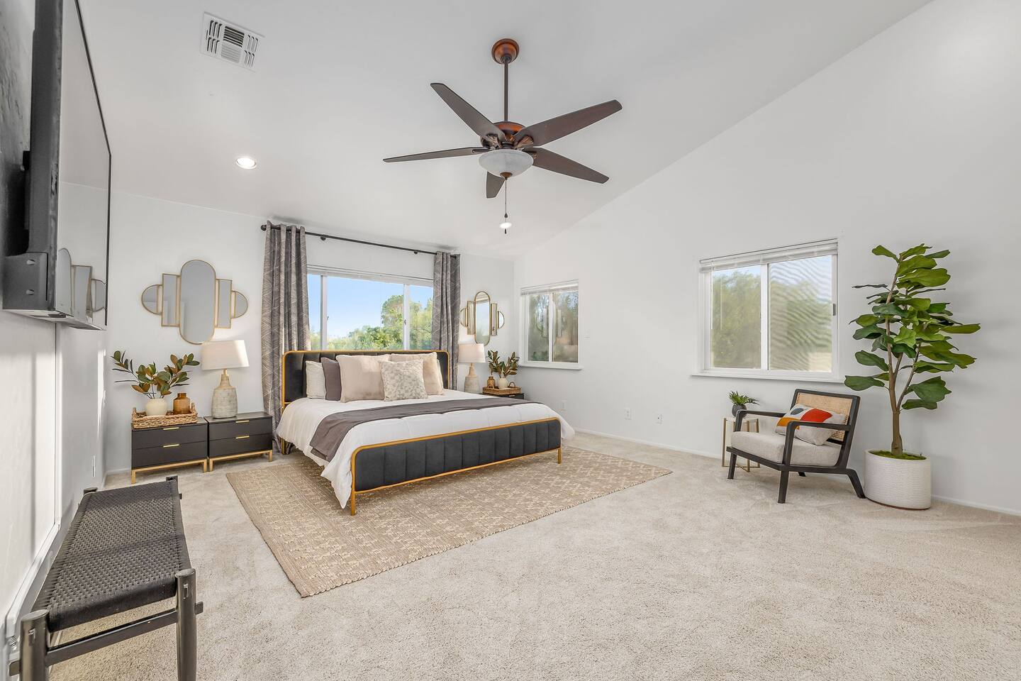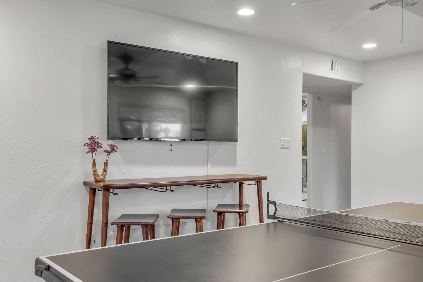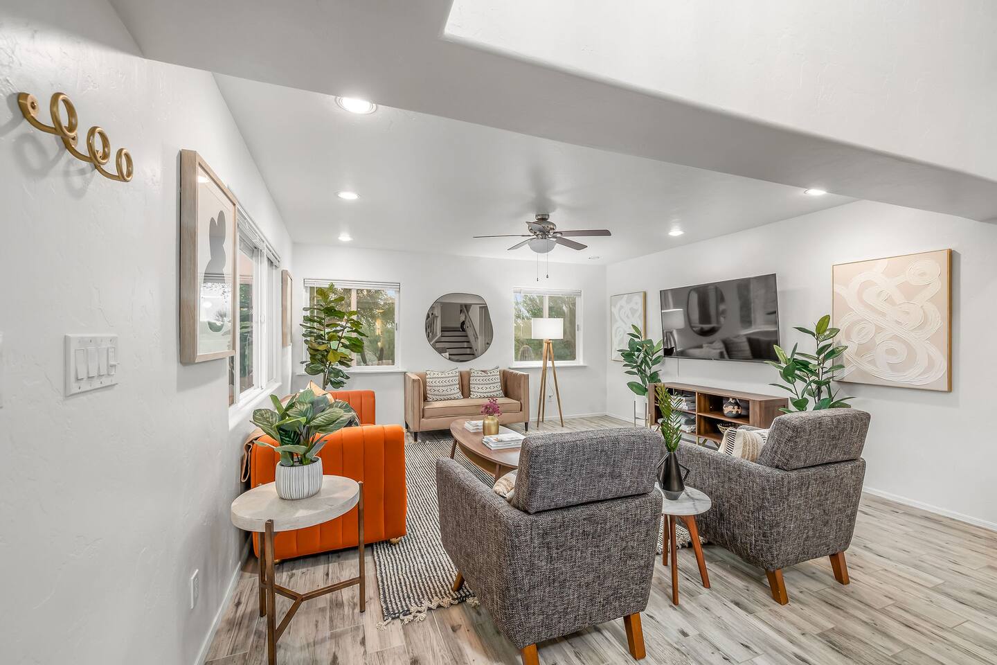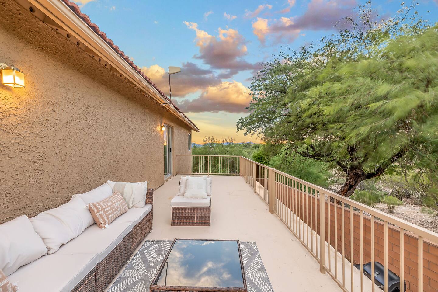 Stylish and fully-renovated home is a picture-perfect desert oasis. Spacious 5 bedroom/4 full baths, offers a breezy open concept living space, gorgeous oversized kitchen, game room with ping pong, and an additional office space upstairs. Beautifully landscaped backyard with an extended covered patio, balconies to take in the views, fire pit, and sparkling pool. Enjoy mountain views and privacy while only being minutes from premiere shopping, hiking, dining, and grocery stores.