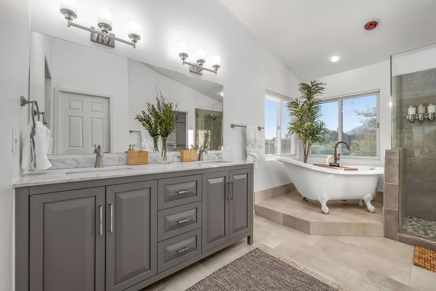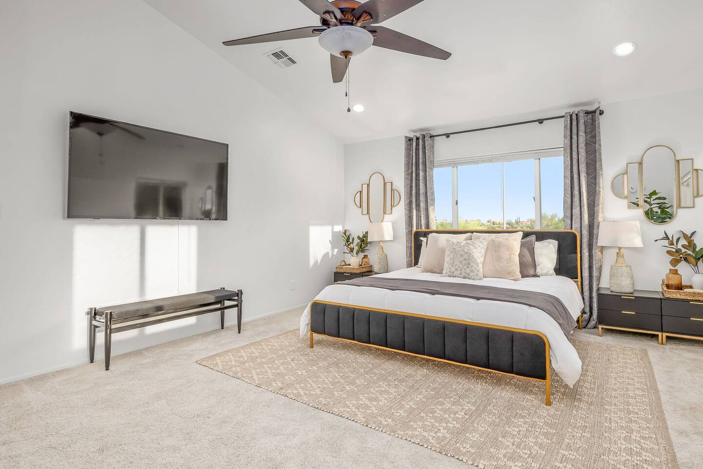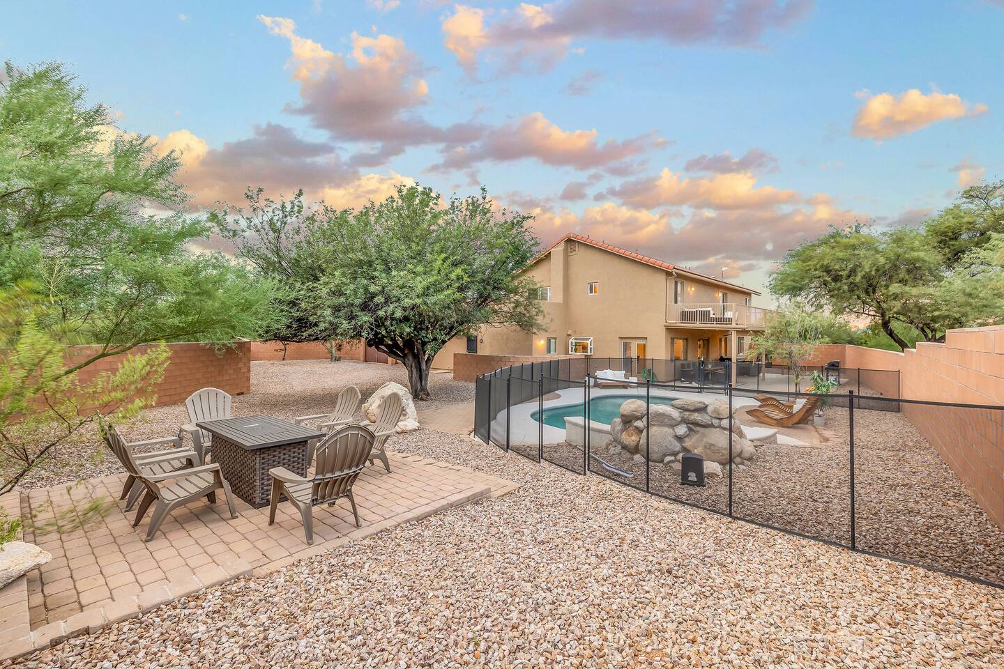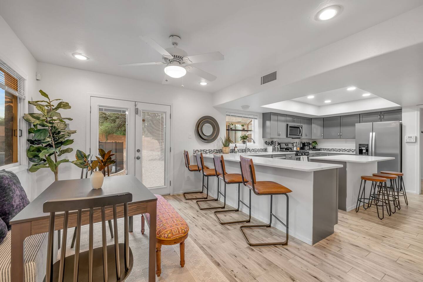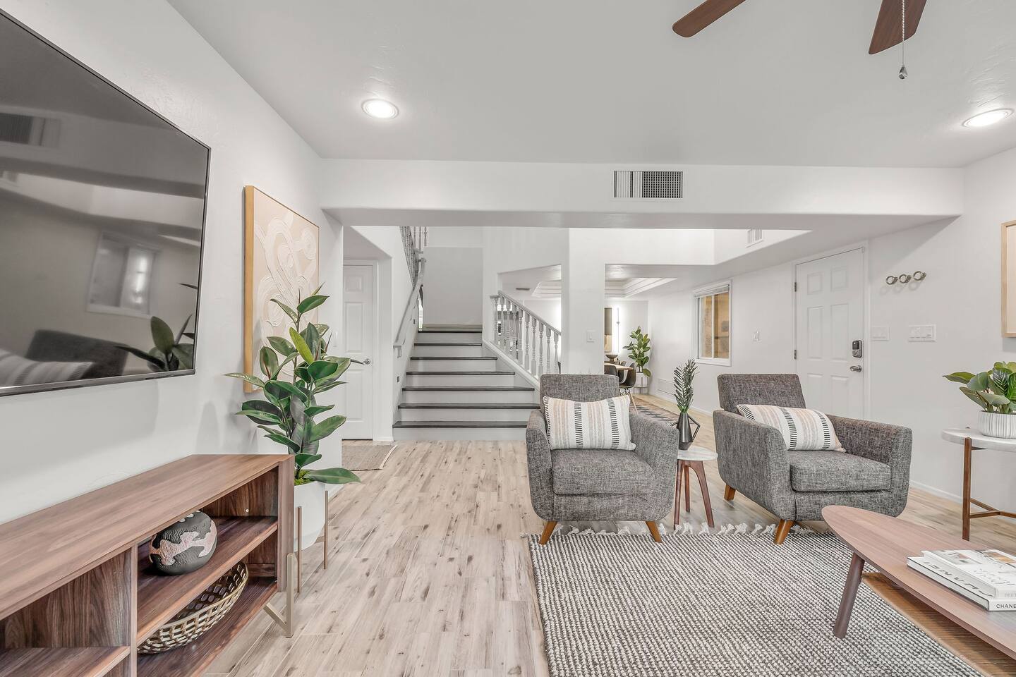 Stylish and fully-renovated home is a picture-perfect desert oasis. Spacious 5 bedroom/4 full baths, offers a breezy open concept living space, gorgeous oversized kitchen, game room with ping pong, and an additional office space upstairs. Beautifully landscaped backyard with an extended covered patio, balconies to take in the views, fire pit, and sparkling pool. Enjoy mountain views and privacy while only being minutes from premiere shopping, hiking, dining, and grocery stores.