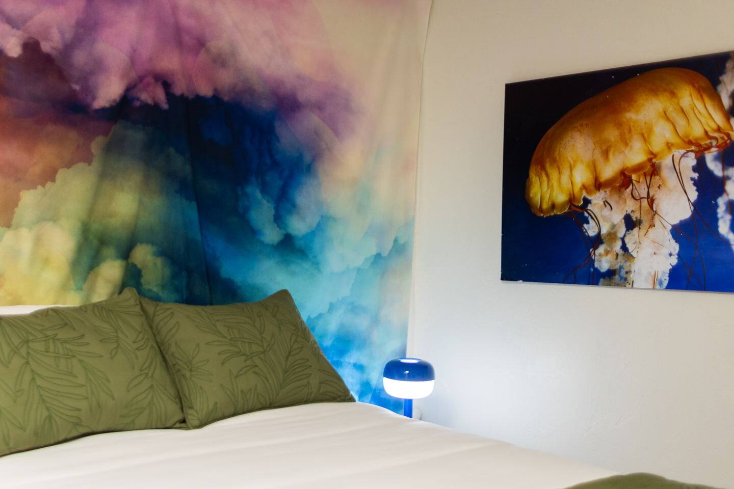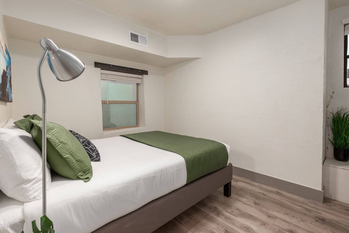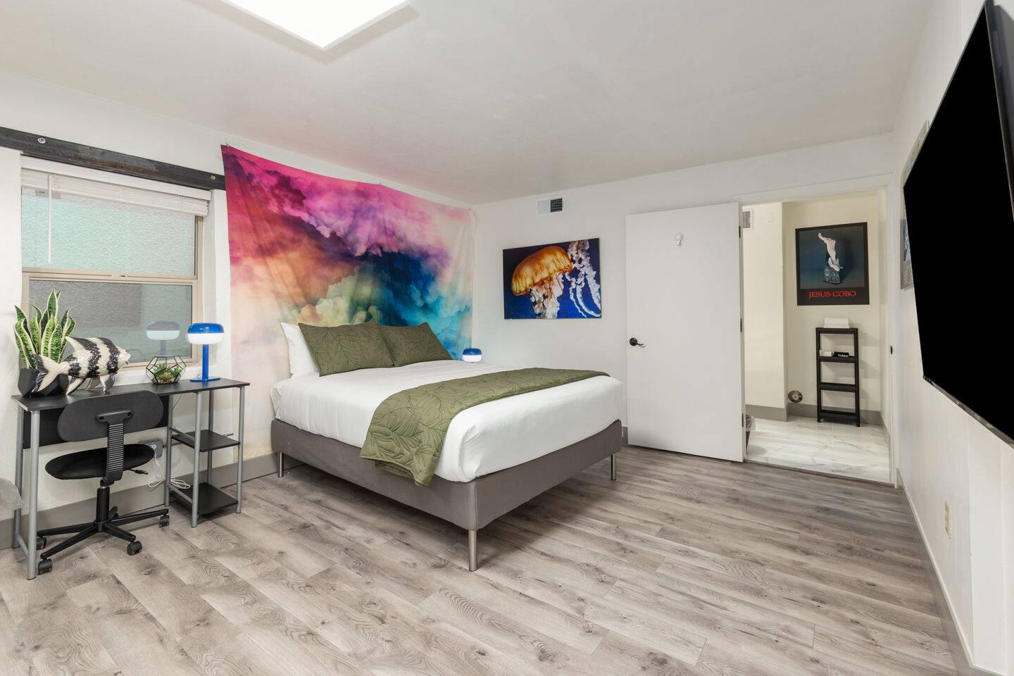 Welcome to "The Loft" – Your Unique Tucson Retreat! Located at the corner of Stone and University, our property boasts a prime central location in the heart of Tucson. This unique, two-story loft is designed to offer you a comfortable and memorable stay. On the first floor, you'll find a vibrant bedroom with a colorful backdrop, an attached full bathroom featuring a walk-in shower, and a convenient washing machine. The second floor features a fully equipped kitchen, perfect for all your cooking needs, a dining area with a cozy table, and a comfortable living room to relax and unwind. You'll also find another spacious bedroom and a unique bathroom setup with a sink and toilet on one side and a shower and sink on the other, each with its own door for added privacy. Additionally, there is an extra toilet and sink on this floor. The layout is ideal for slightly larger groups, offering a closed area concept that ensures privacy. The upstairs bathroom situation is truly unique – nothing like it! The loft is equipped with a fully stocked kitchen, high-speed WiFi, and two spacious bedrooms, making it perfect for both work and leisure. "The Loft" is both unique and welcoming, with beautiful evening light and an authentic city feel. While you might hear the downtown train and West University traffic from the west-facing windows, the room itself is warm and bright. Whether you're here for a college visit, a work-related trip, or just exploring Tucson, our loft offers a great work atmosphere and a convenient respite. We look forward to hosting you and ensuring you have an unforgettable stay in Tucson!