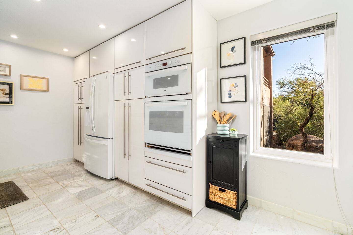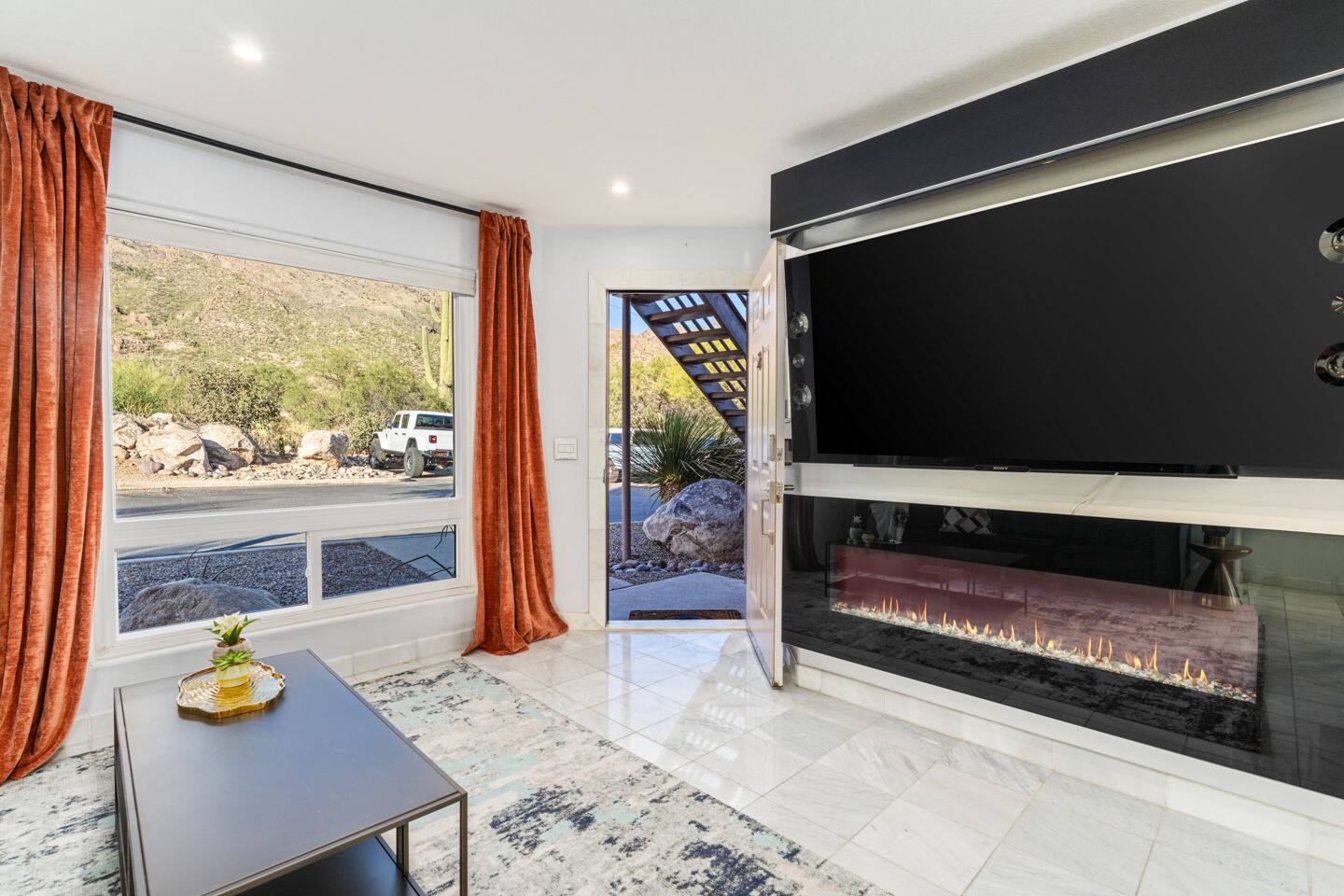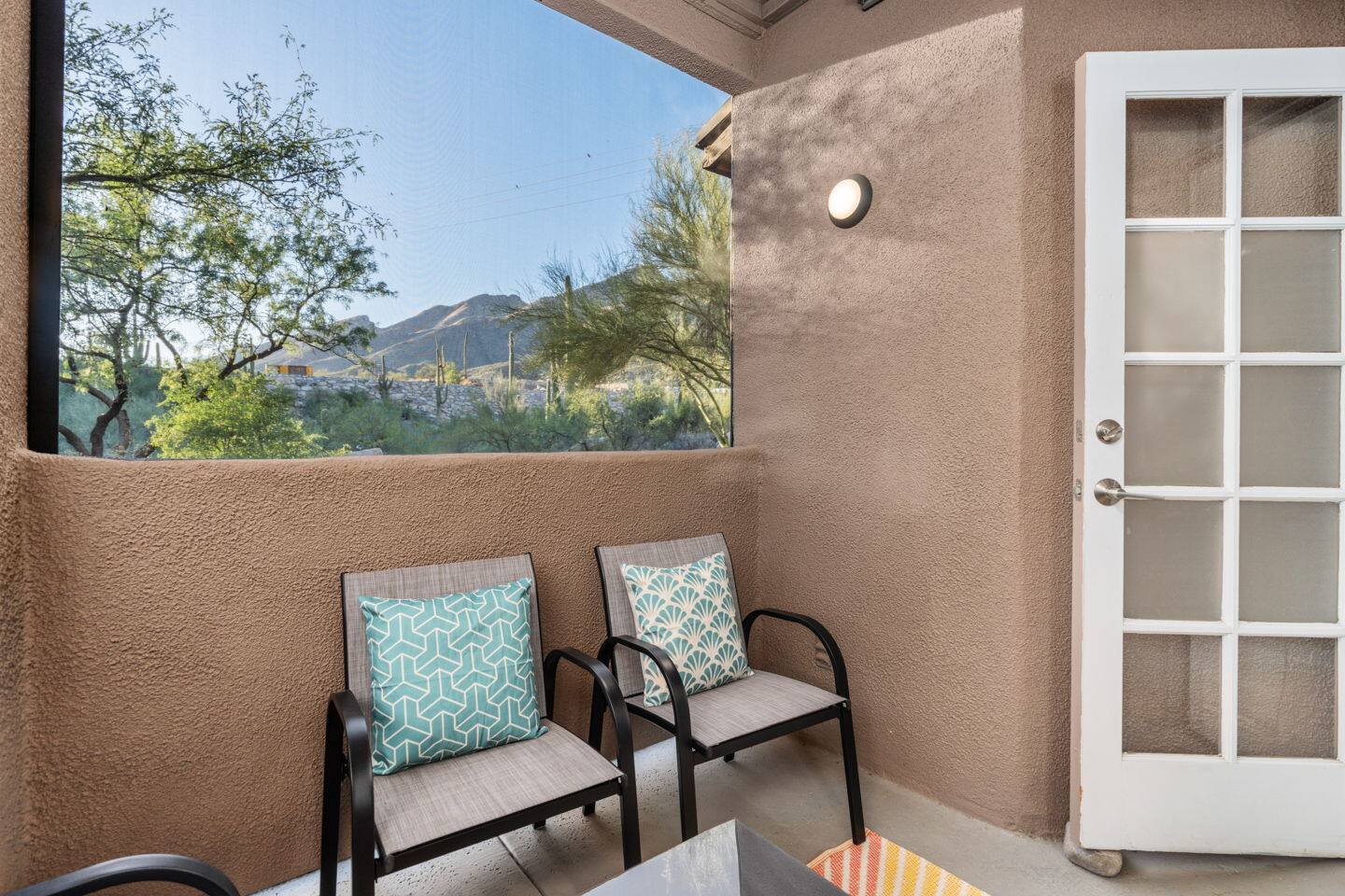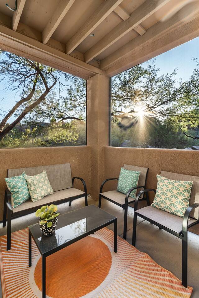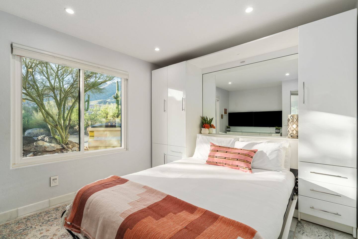 Nestled at the base of the majestic Catalina Mountain Range, our ground floor condominium in Tucson's enchanting Catalina Foothills offers an unbeatable location. Step into this 2-bedroom, 2-bath haven, where every detail is thoughtfully designed for your comfort. The spacious primary bedroom suite features a queen-size bed, a tub/shower combo, and dual sinks, ample closet space. The second bedroom is adorned with a queen-size Murphy bed, a versatile desk, and its own 2 TV's which double as additional computer monitors, ensuring everyone's needs are met. In the well-appointed kitchen, you'll find all the essentials, from a coffee maker to a microwave, blender, and a full range of cookware. Please note that there's no stove range, but we provide 2 hot plates, a toaster oven, microwave, and oven for your culinary creations. The living room exudes coziness with a welcoming sofa, a fireplace, and a generously sized streaming TV for relaxation. Elegant heated marble floors and tasteful artwork add to the inviting ambiance. Need to work remotely? We've got you covered with high-speed internet and two additional TVs that can double as monitors at the desk. Step outside to the private patio, screened in for your comfort, and enjoy serene evenings or a refreshing morning coffee. The lush surroundings, teeming with trees and greenery, attract diverse bird species, while nature stunning backdrop. Nature lovers will delight in the proximity to the gated entrance of the Ventana Canyon #98 Hiking Trail, just a short stroll from your front door. This condominium in Tucson's Catalina Foothills is a true gem, offering comfort, convenience, and a haven for those who appreciate the beauty of the outdoors. Welcome to your perfect retreat!